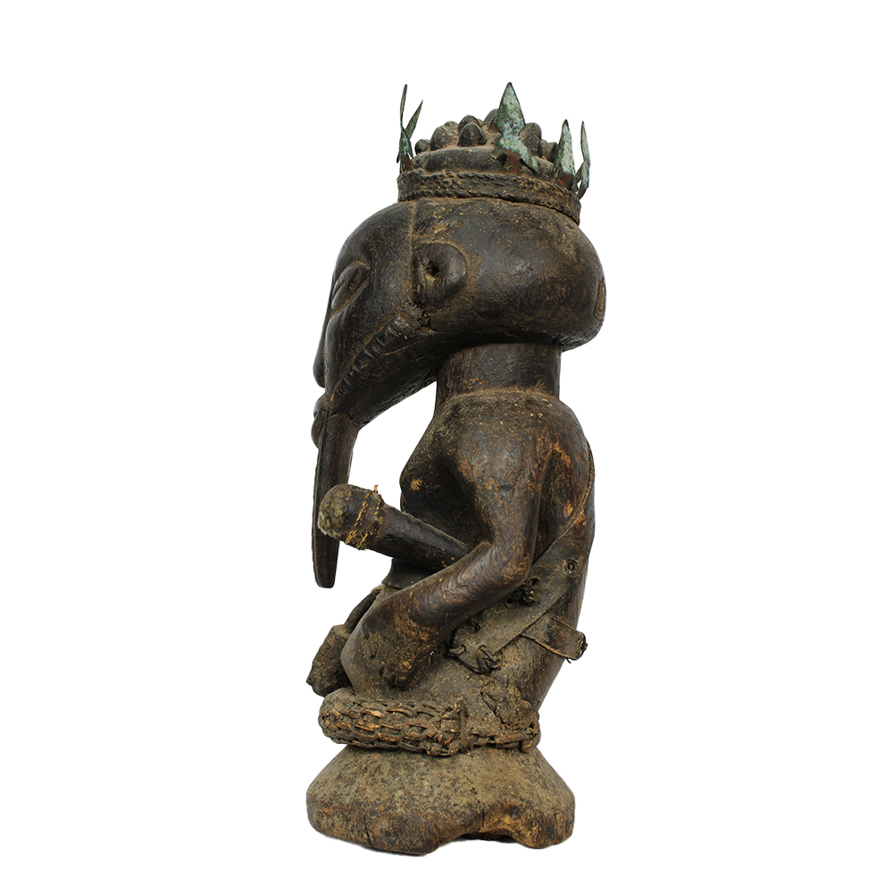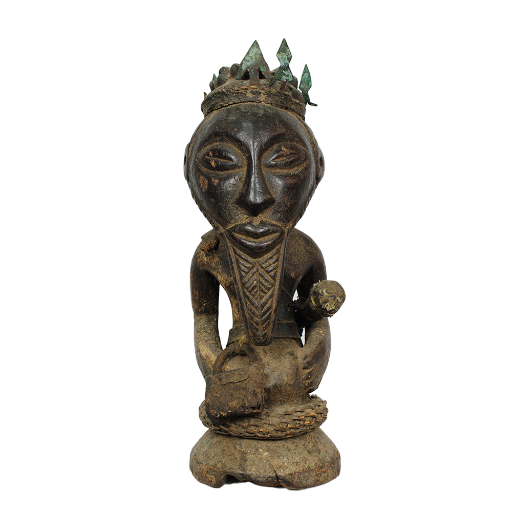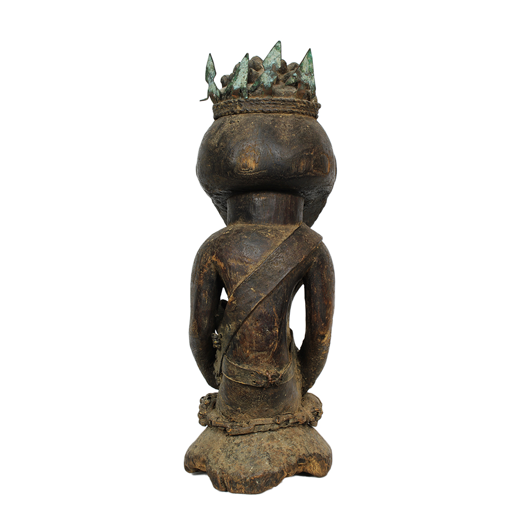 FIGURA MAGICA RITUALE KABEJA etnia Bakuso, in legno patina scura, lamierino di rame cuoio vimini lucchetto stoffa e sostanze magiche, con cavità sulla testa e addome per contenere sostanze magiche, aveva la funzione di protezione contro le forze del male. Repubblica democratica del Congo h cm 33 x 11