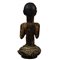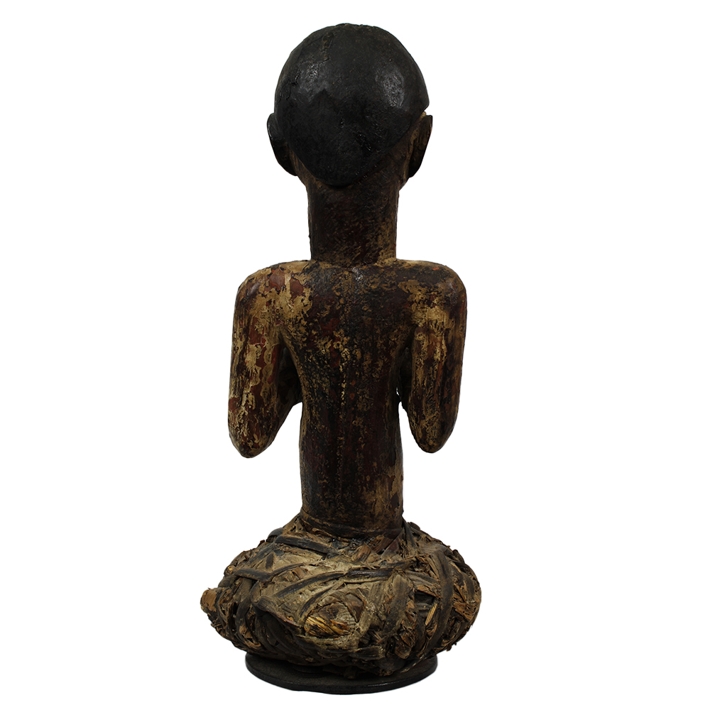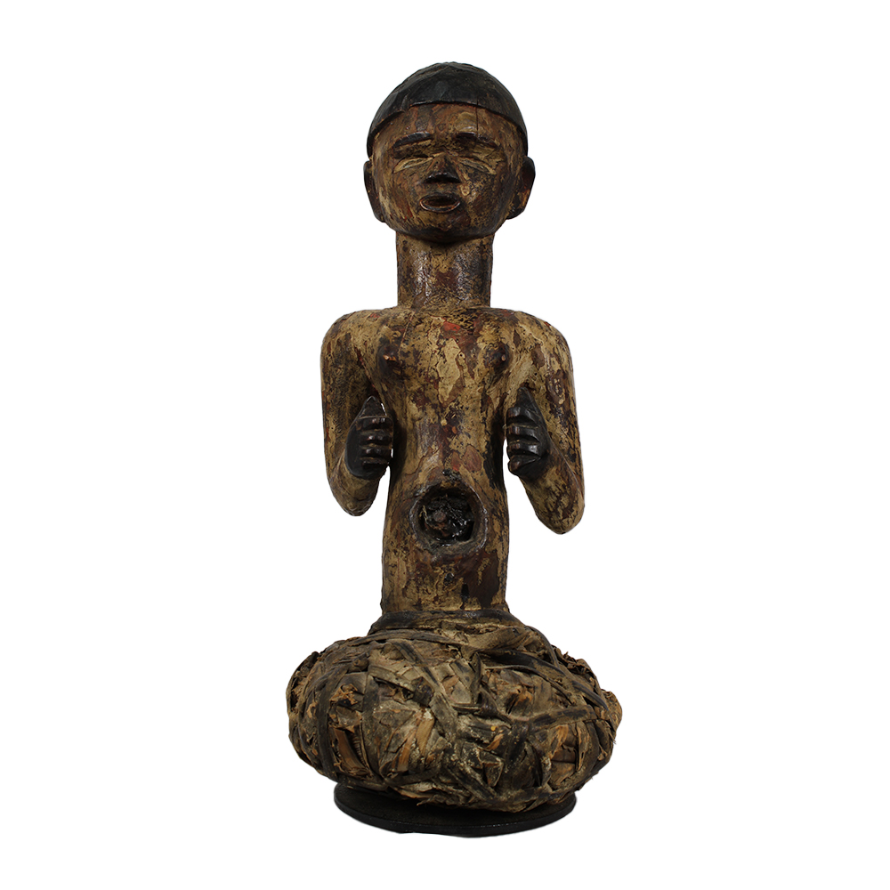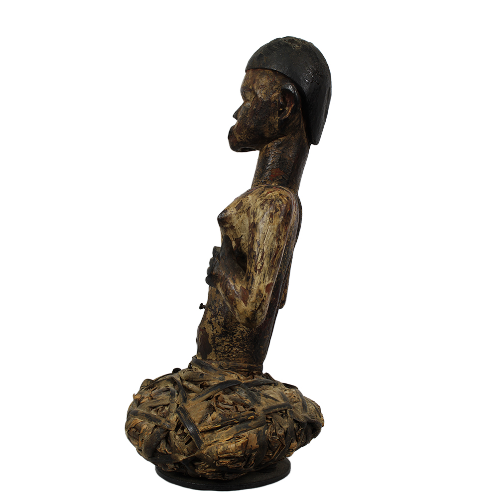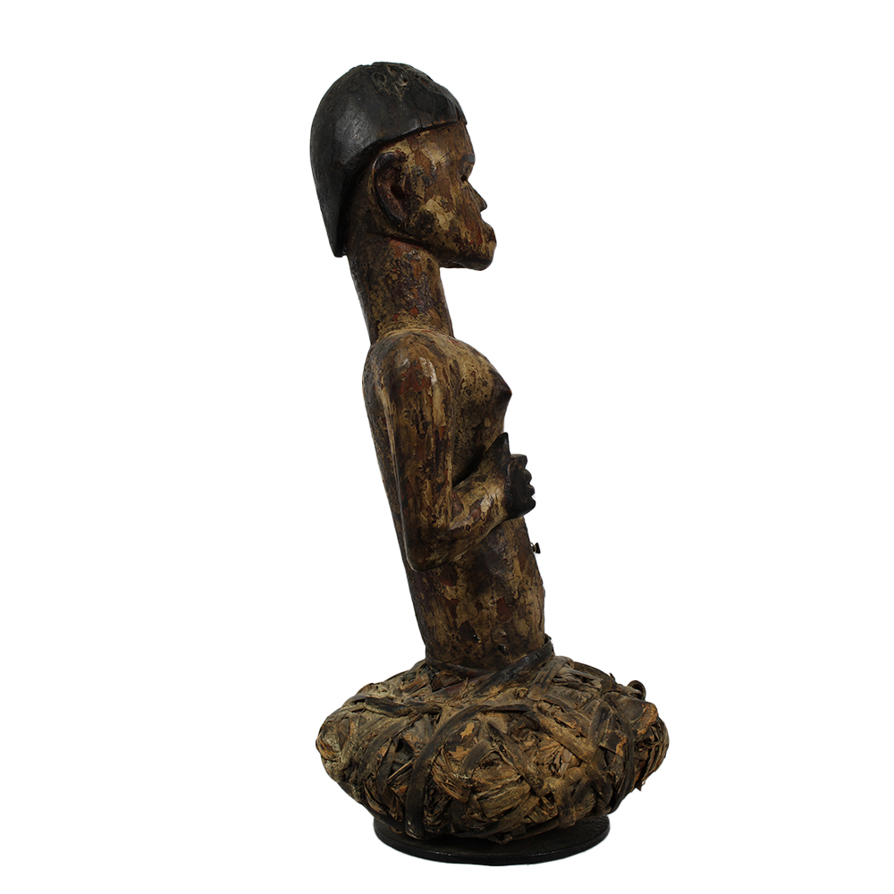 RELIQUIARIO NKHOSI etnia Lumbo in legno patina sacrificale chiodo fibre vegetali frammenti di specchio pigmenti sostanze magiche. Posto sopra una cesta a guardia del suo contenuto in ossa e reliquie del defunto. Repubblica del Congo h cm 39 x 16