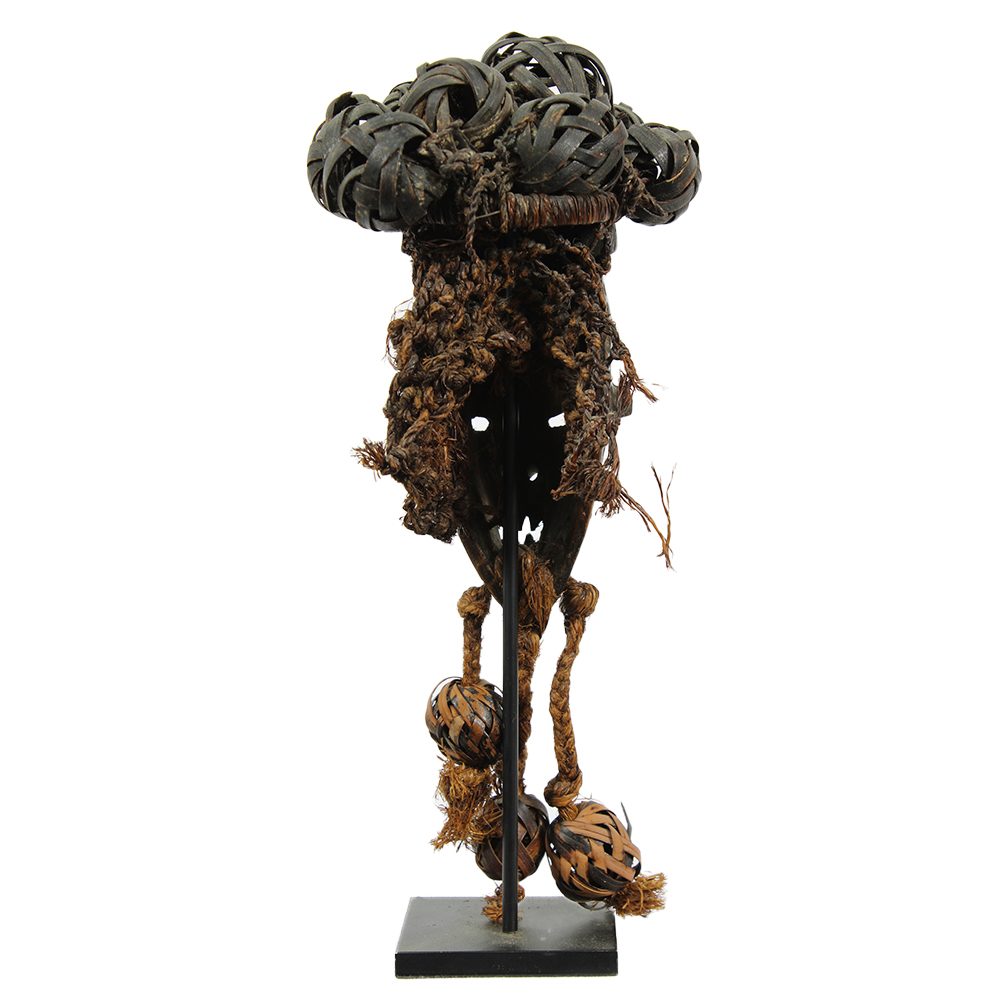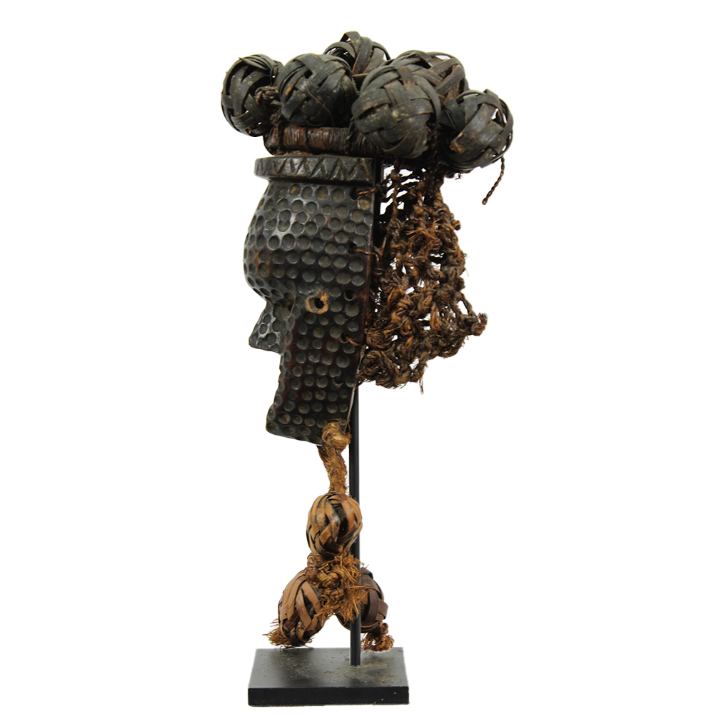 MASCHERA MINIATURA MUKINGA etnia Salampasu, in legno patina scura rattan fibre vegetali tracce di caolino, piccole maschere legate al braccio indicanti l'appartenenza alla società di guerrieri Mungongo. Repubblica democratica dl Congo h cm 31 x 10 x 10