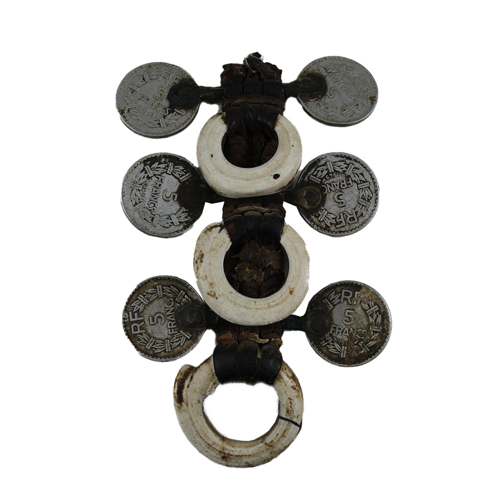 AMULETO FAMILIARE TUAREGH KEL HOGGAR in cuoio conchiglie e monete di conio francese, posto all'ingresso delle capanne per proteggere le donne dalla sterilità. Le monete sono del 1949 e fanno dedurre che l'amuleto sia di epoca coloniale. Algeria h cm 15 x 10