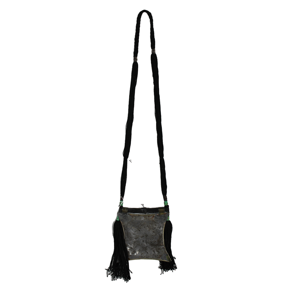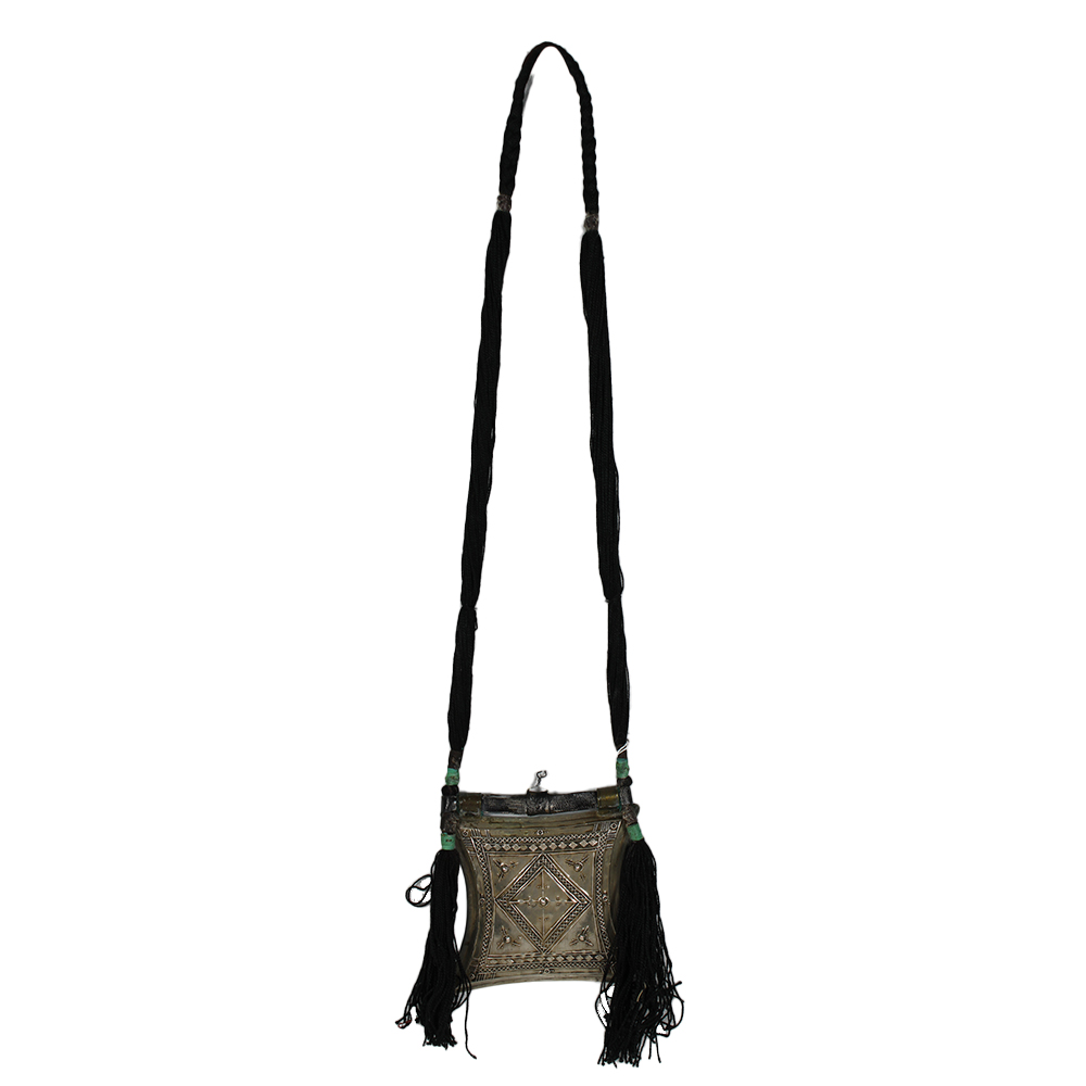 COLLANA CON PORTAMULETI TCHEROT. TUAREGH KEL AIR in metallo argentato pelle e lana. Il simbolismo dei tuaregh è spesso di difficile interpretazione essendo un misto tra quello animista e quello di matrice musulmana. Niger h cm 46 x 10,5