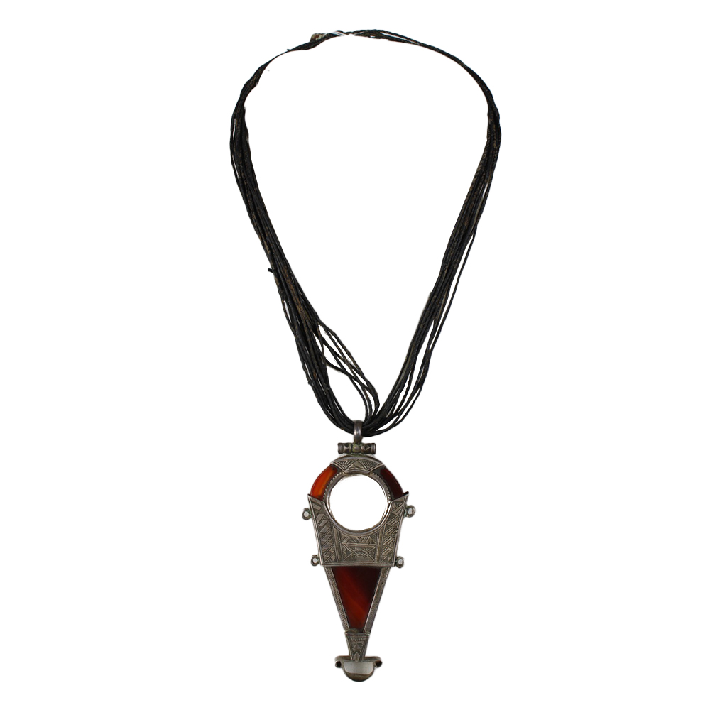 COLLANA CON PENDENTE TAUNFOUK DEI TUAREGH JULLEMIDEN Collana con pendente Taunfouk dei tuaregh jullemiden in metallo argentato Cuoio cornalina. Pendente dal colore rosso simbolo nell'antico Egitto di vita, protegge secondo le usanze dal veleno dei serpenti. Niger cm 33