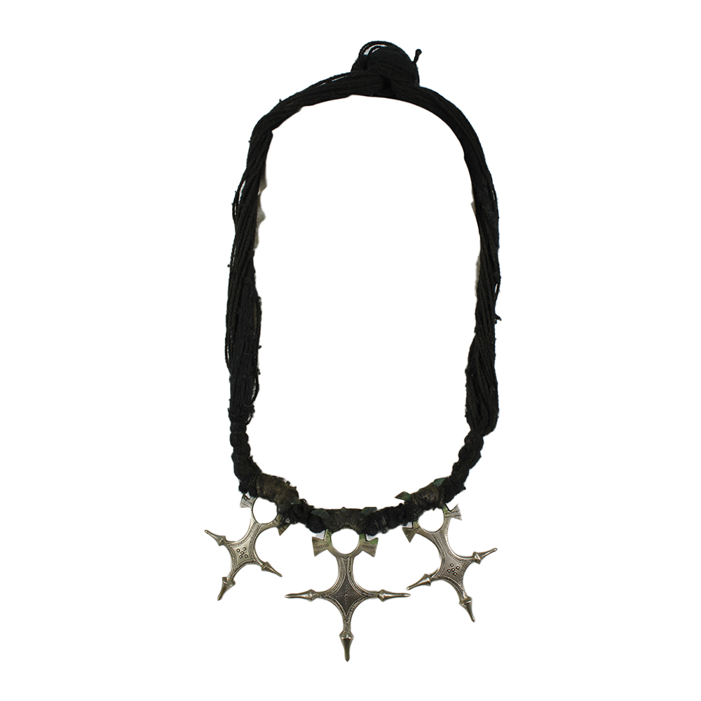 COLLANA CON CROCI TIMERALT etnia tuaregh jullemiden in metallo argentato E lana, ornamento della zona di Agadesi con croci simbolo della fertilità per entrambi i sessi. Niger cm 55