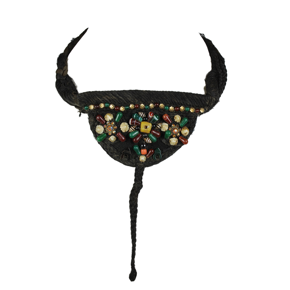 ORNAMENTO DA TESTA per danzatrici di guedra Charwita etnia mauri, in tessuto di lana ambra perline di vetro e conchiglie, la Charwita che adorna la fronte della donna è tipica di queste danzatrici. Mauritania cm Ø 28