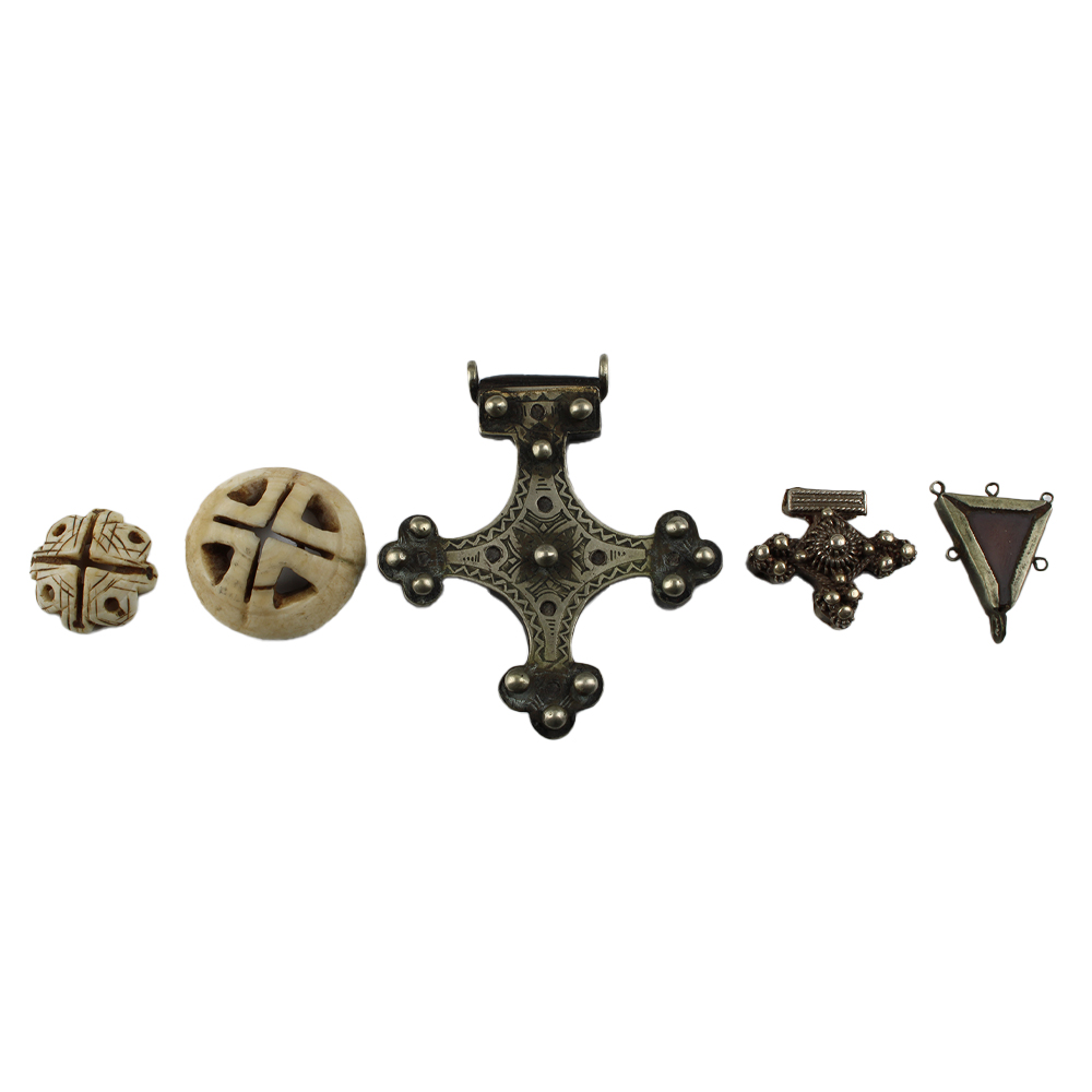 LOTTO DI 3 pendenti e 2 conchiglie scavate di cui una croce boghdad in metallo argentato ebano e conchiglie.. Mauritania del sud misure varie
