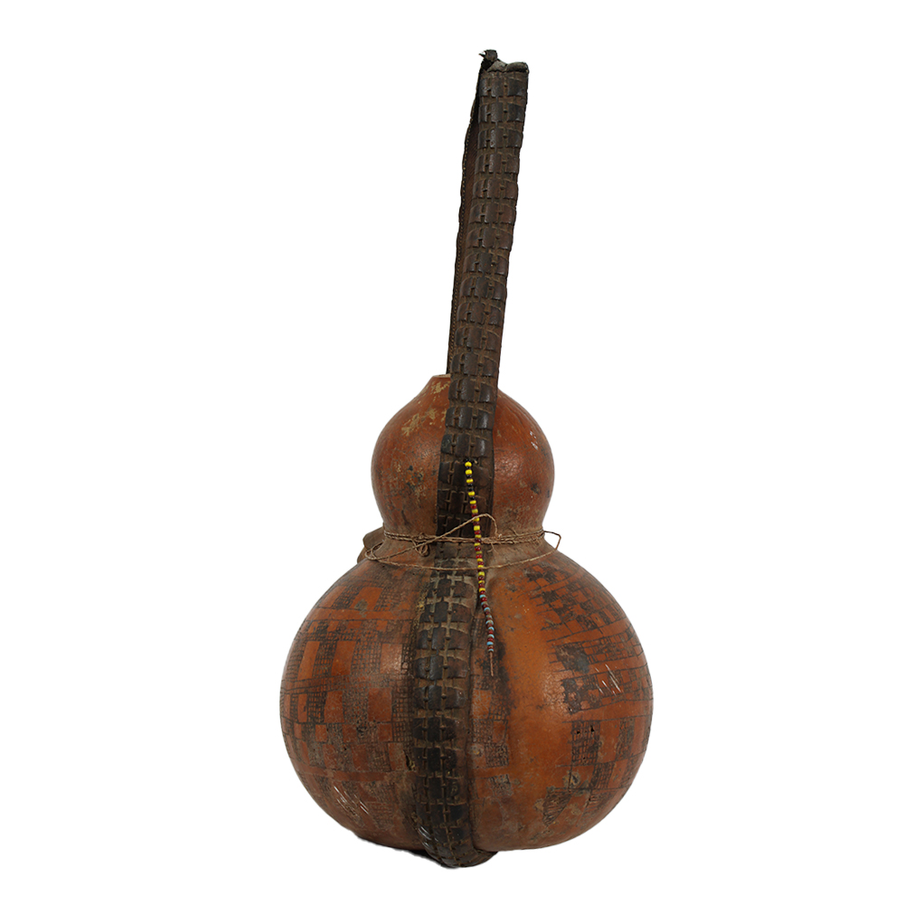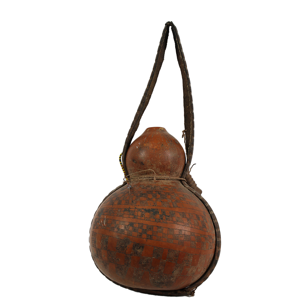 CONTENITORE PER LIQUIDI HAMER in zucca pirografata legno copertone di gomma perline di vetro e cauri. Etiopia h cm 42 x 20