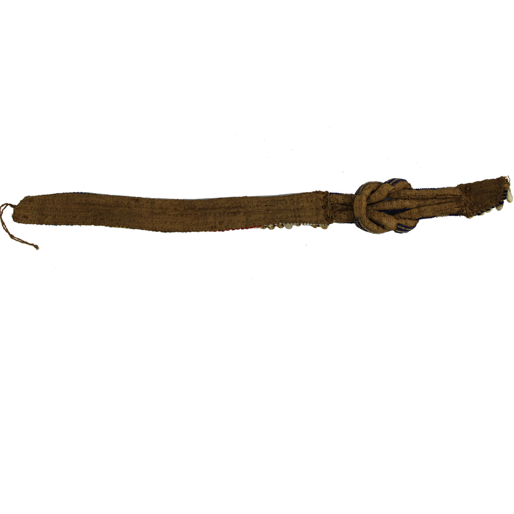 CINTURA PER COSTUME CERIMONIALE NKODY MAKWOM etnia Bushongo Kuba in tessuto di rafia perline di vetro e cauri. Cintura indossata solo dai dignitari di corte con la caratteristica applicazione di fiori di cauri su una estremità. Repubblica democratica del Congo h cm 58 x 6