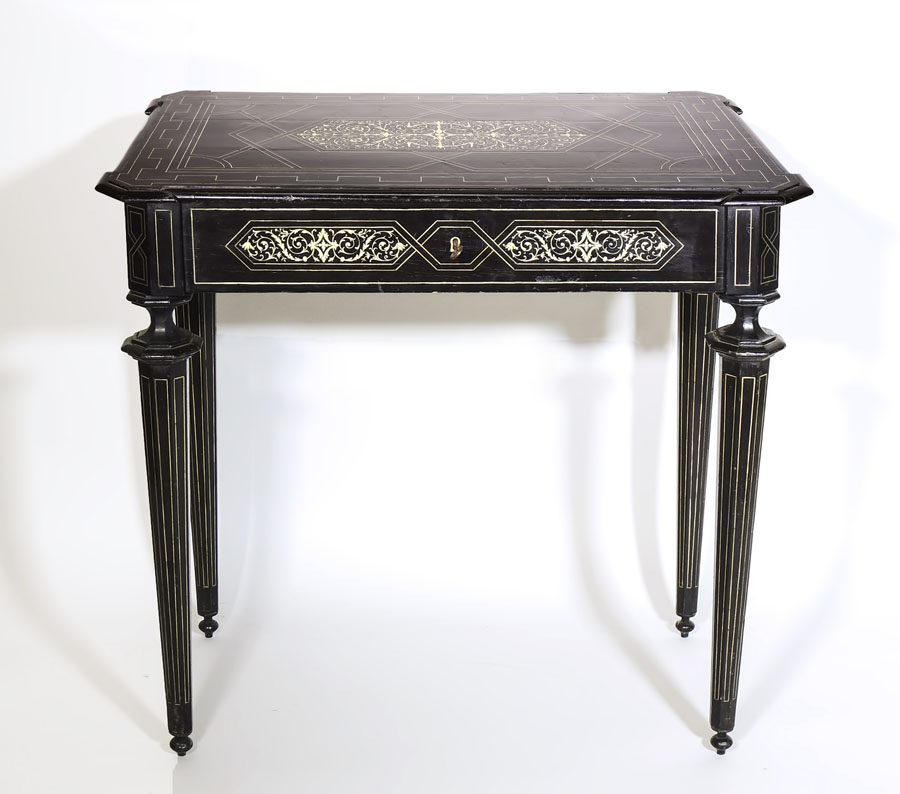 TAVOLINO DA CENTRO IN LEGNO EBANIZZATO seconda metà del XIX secolo intarsiato in avorio e metallo con filettature, volute e girali, un cassetto nella fascia, gambe a faretra, piedini a trottola h cm 78x83x53 Reca iscritto a inchiostro "Deluigi Guelfo fece nel mese di maggio 1882 a Ferrara questo mobile" BLACK LACQUERED AND IVORY AND METAL INLAID TABLE, SECOND HALF OF 19TH CENTURY