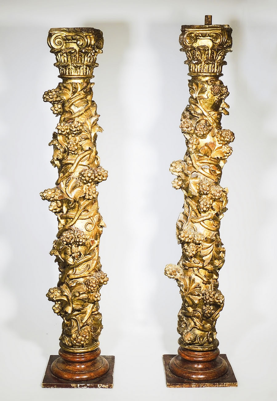 COPPIA DI COLONNE IN LEGNO INTAGLIATO E DORATO XVIII secolo fusto a torciglione intagliato con tralci di vite e grappoli d'uva, capitelli compositi, alcuni difetti e mancanze h cm 175 PAIR OF GILTWOOD COLUMNS, 18TH CENTURY