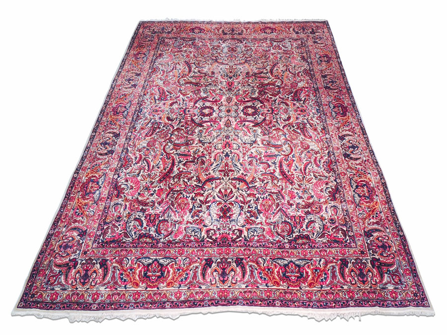 TAPPETO PERSIANO fondo avorio, campo con motivi floreali e vegetali stilizzati nei toni del rosso, arancio, rosa e blu cm 265x355 PERSIAN CARPET