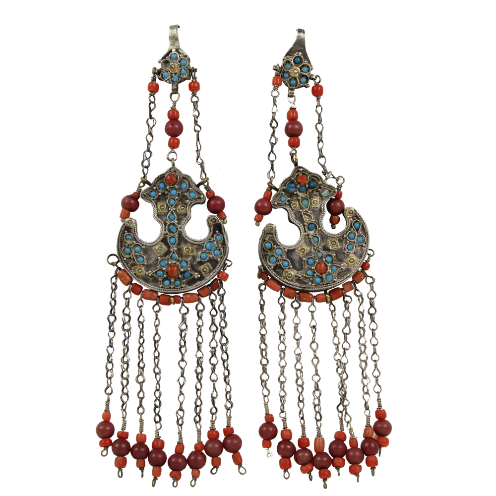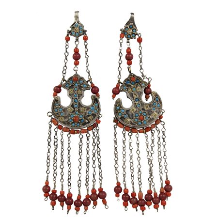 ORNAMENTI DA TESTA MOKHI TILLO in argento dorato turchesi e corallo. Uzbekistan h cm 17 x 5