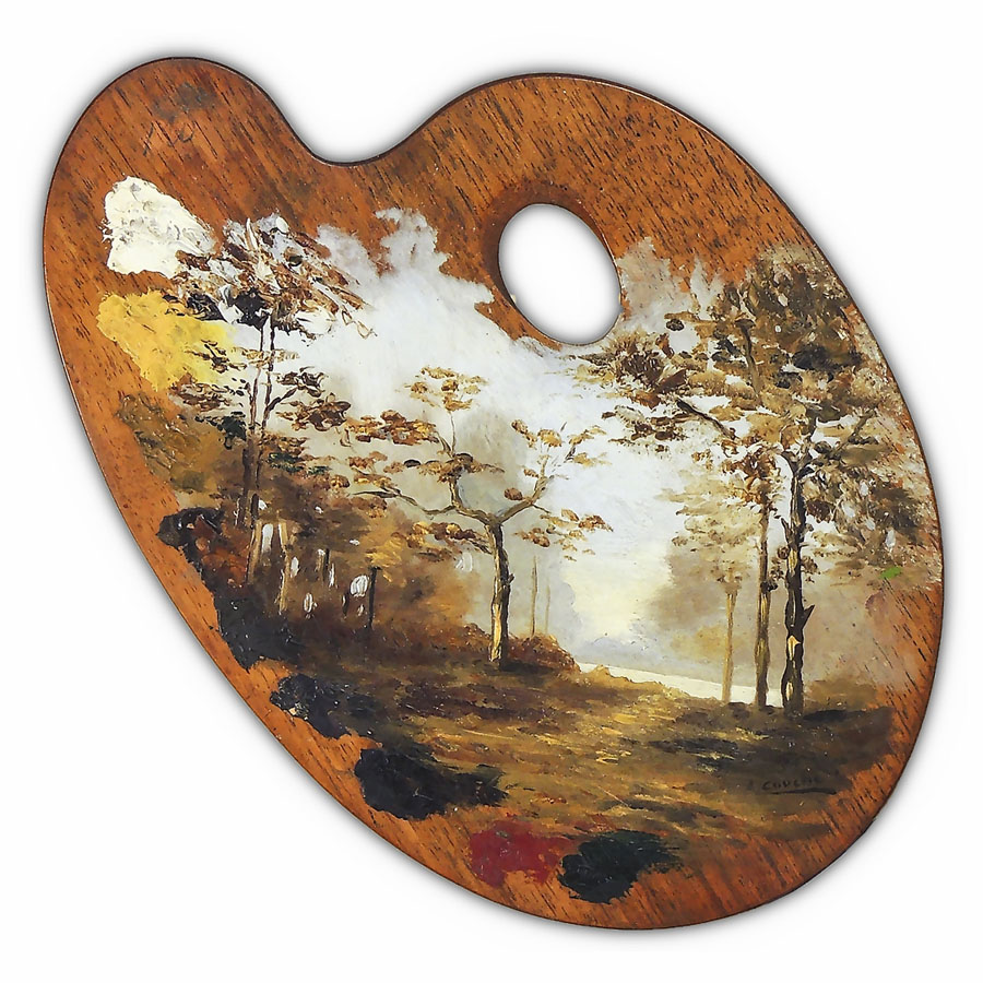 PAESAGGIO FLUVIALE inizio del XX secolo olio su tavolozza da pittore, firmato River LANDSCAPE, BEGINNING OF 20TH CENTURY, OIL ON PAINTER'S PALETTE