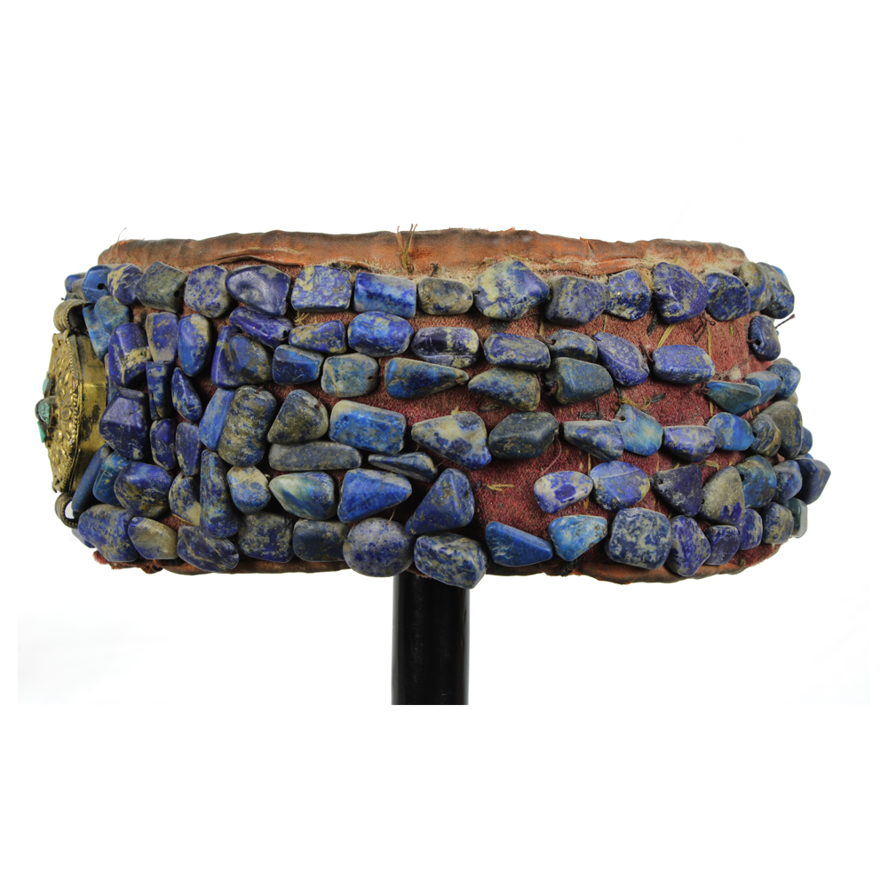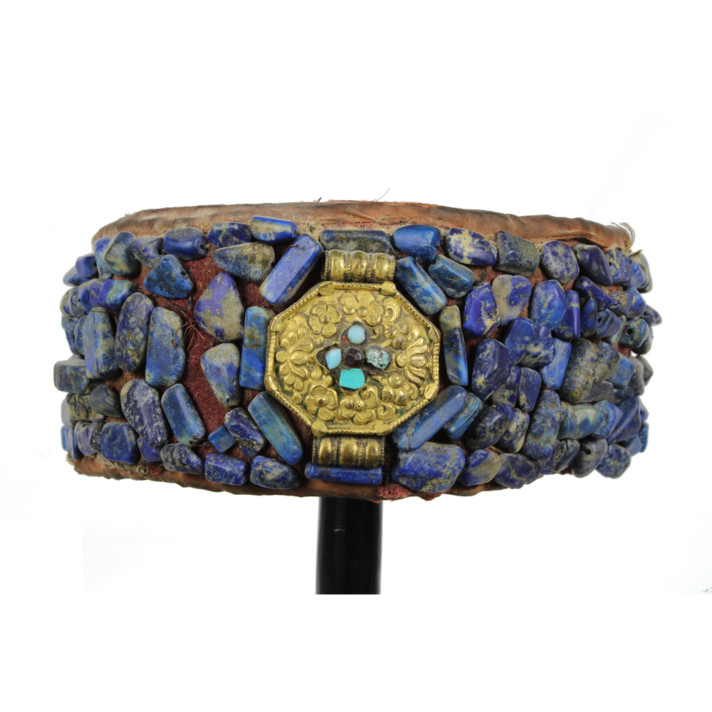 COPRICAPO DA UOMO LADAKH in stoffa lapislazzuli e reliquiario centrale in ottone con turchesi e granati,. India h cm 8 x 18