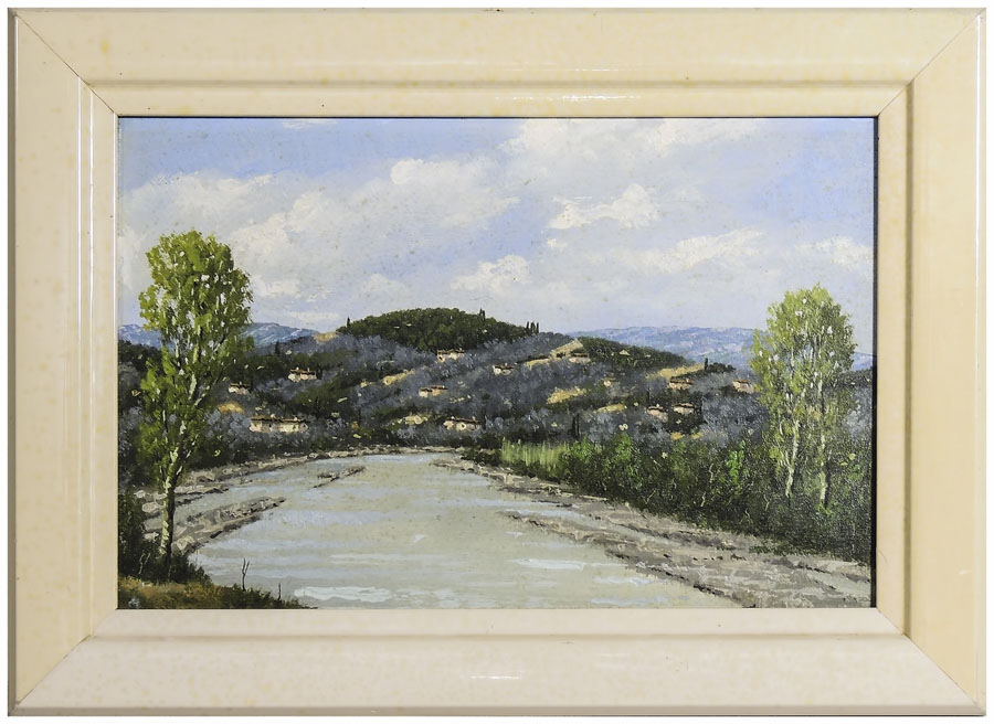 GIACOMO DELCROIX (1894-1972) Veduta di Settignano olio su faesite, in cornice, difetti cm 22x31 SETTIGNANO VIEW, OIL ON FAESITE