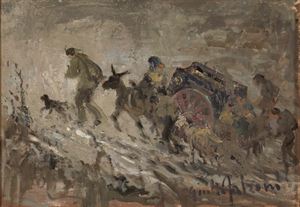 FALZONI GIULIO Marmirolo (MN) 1900-1978 Milano L'organetto 1958 Olio su cartone telato 35x50 cm Firma in basso a destra e al retro con data e titolo Oil on canvas board Signed lower right and to the back with date and title
