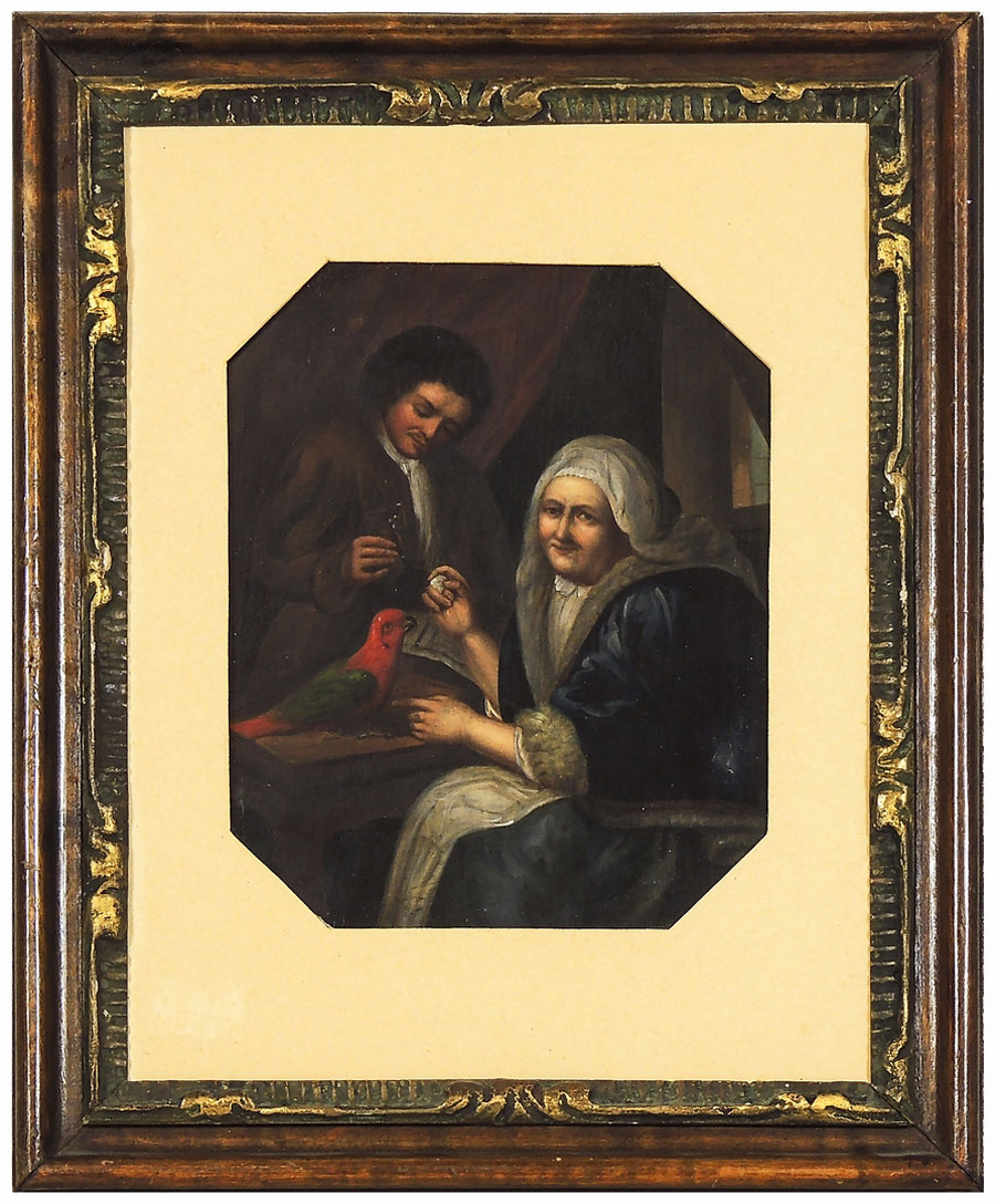 VEDUTA D'INTERNO CON PERSONAGGI E PAPPAGALLO XIX secolo olio su metallo, in cornice cm 20x15,5 INTERIOR VIEW WITH FIGURES AND PARROT, 19TH CENTURY, OIL ON METAL