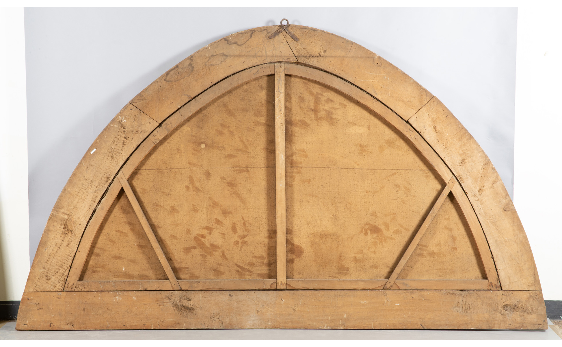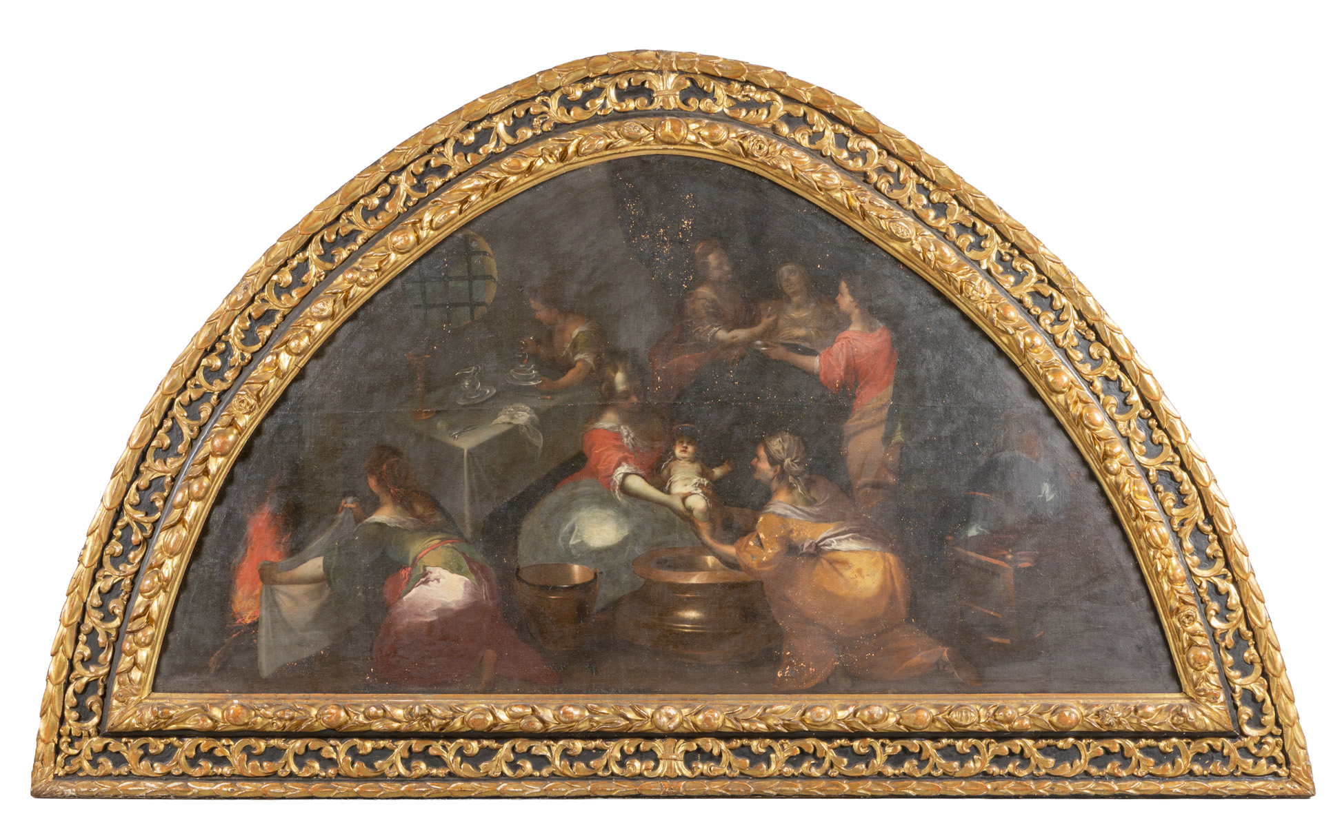 Scuola emiliana sec.XVII 'La nascita della Vergine Maria' olio a forma di lunetta cornice coeva in legno intagliato e dorato