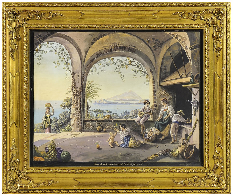 SCENA DI VITA POPOLARE NEL GOLFO DI POZZUOLI gouache su carta, in cornice,...