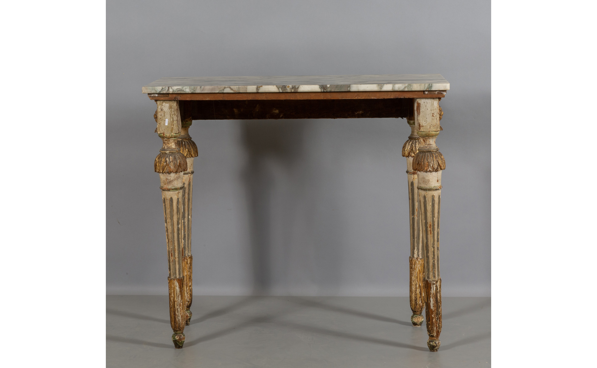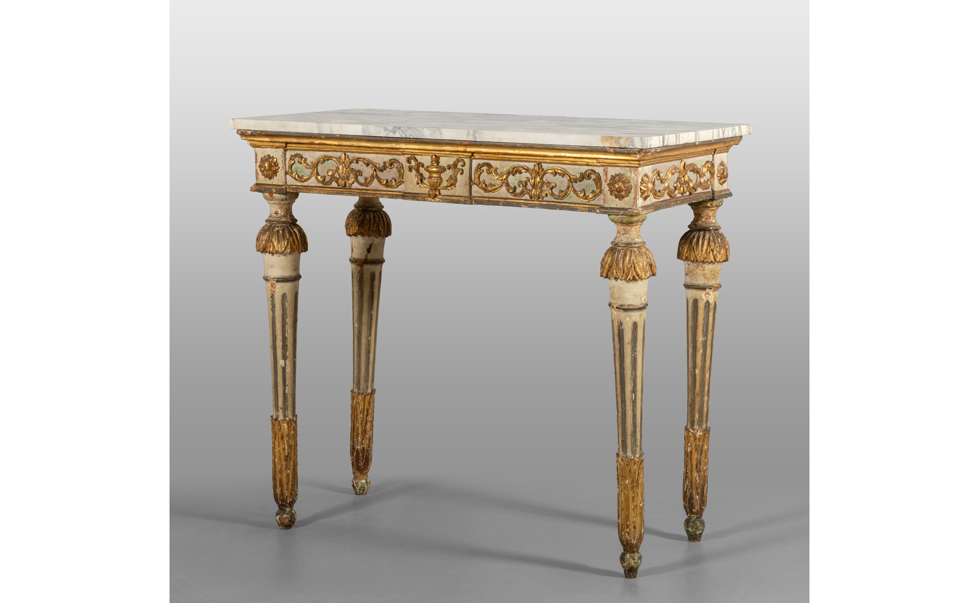 Console Luigi XVI in legno finemente intagliato laccato e dorato piano in marmo Genova II metà sec.XVIII