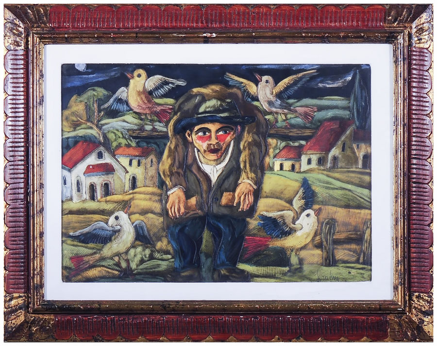 BEPPE SERAFINI (1915-1987) Lo spaventapasseri olio su cartone inciso, firmato, al verso titolato, in cornice cm 50x70 SCARECROW, OIL ON ENGRAVED CARDBOARD