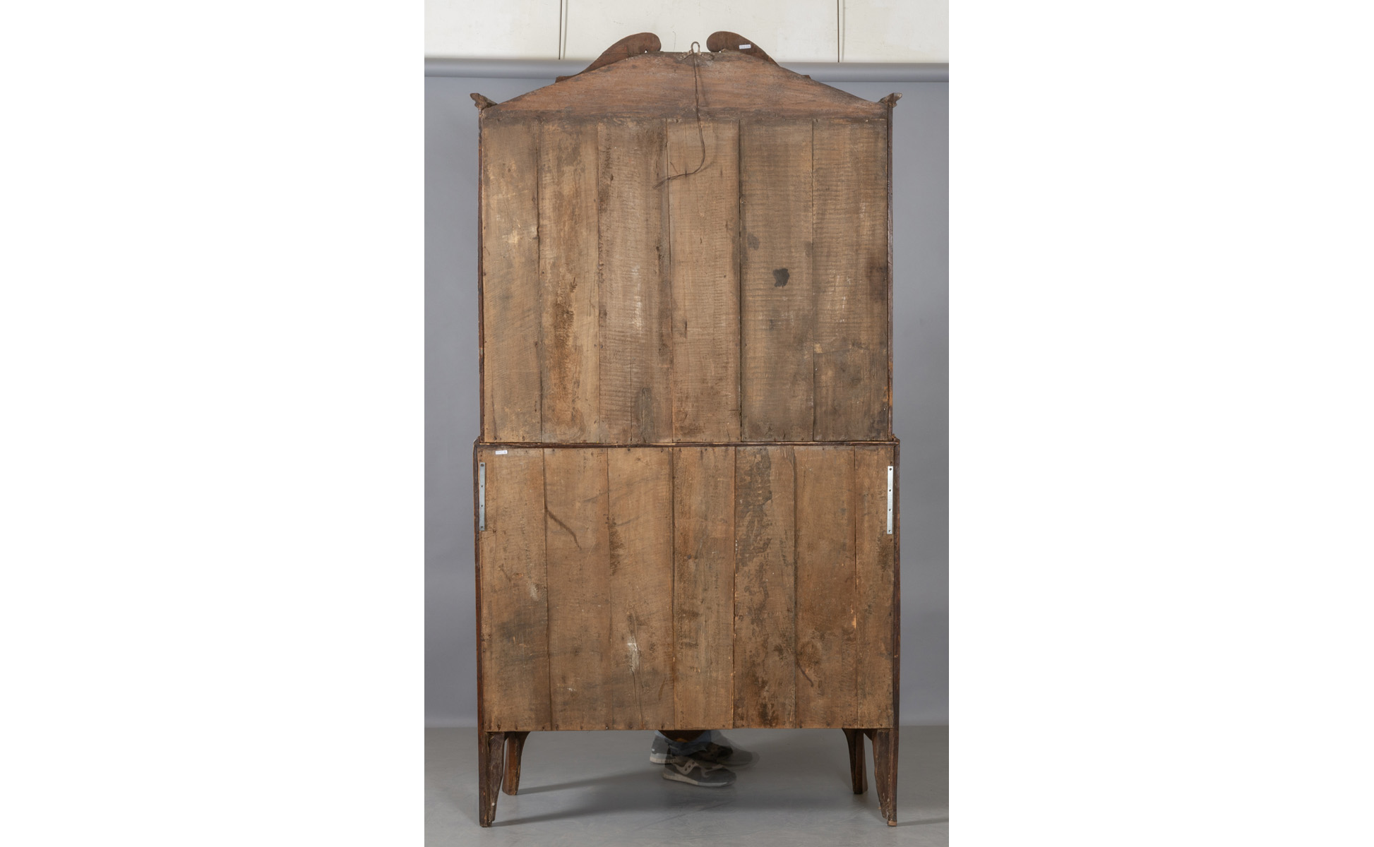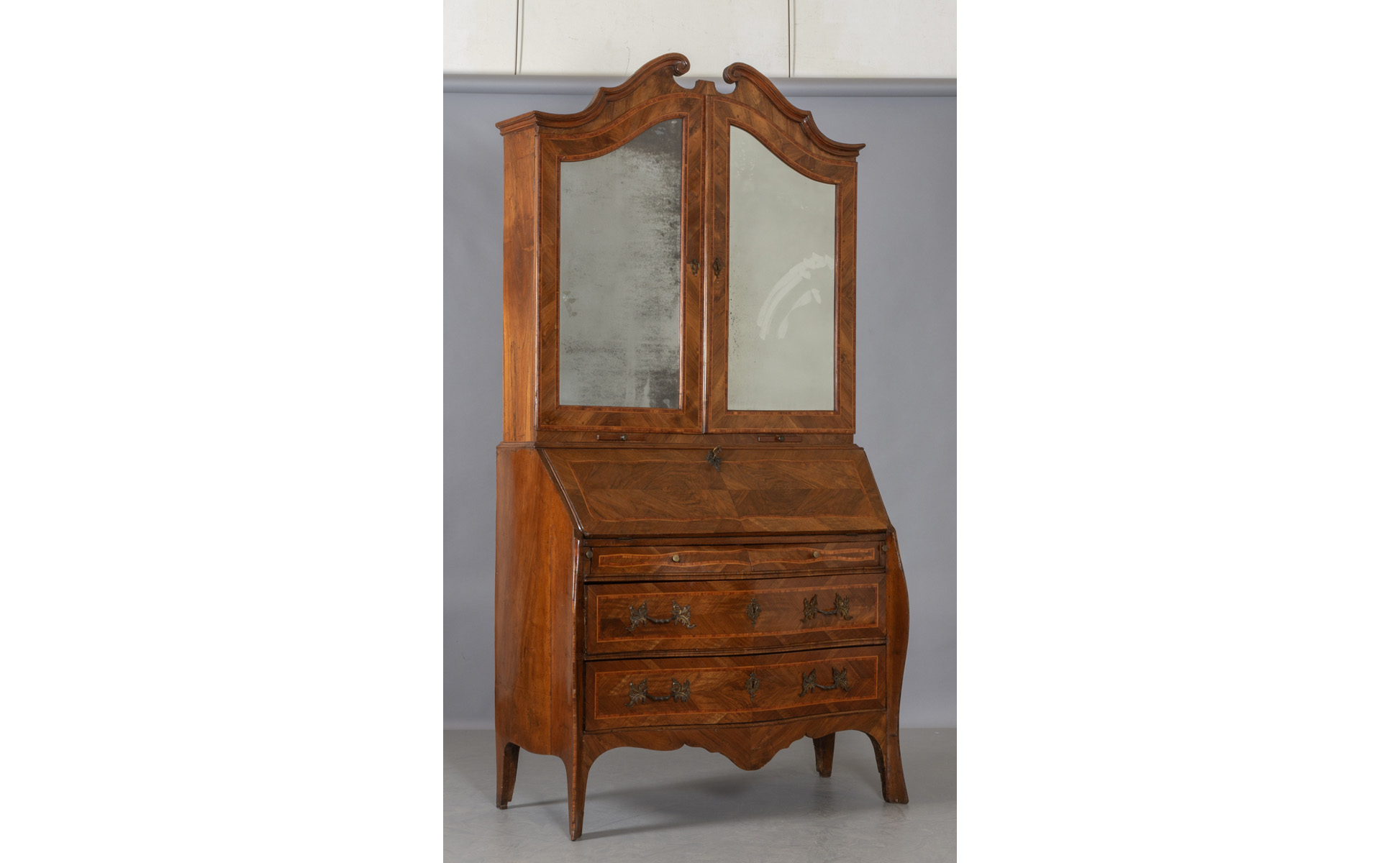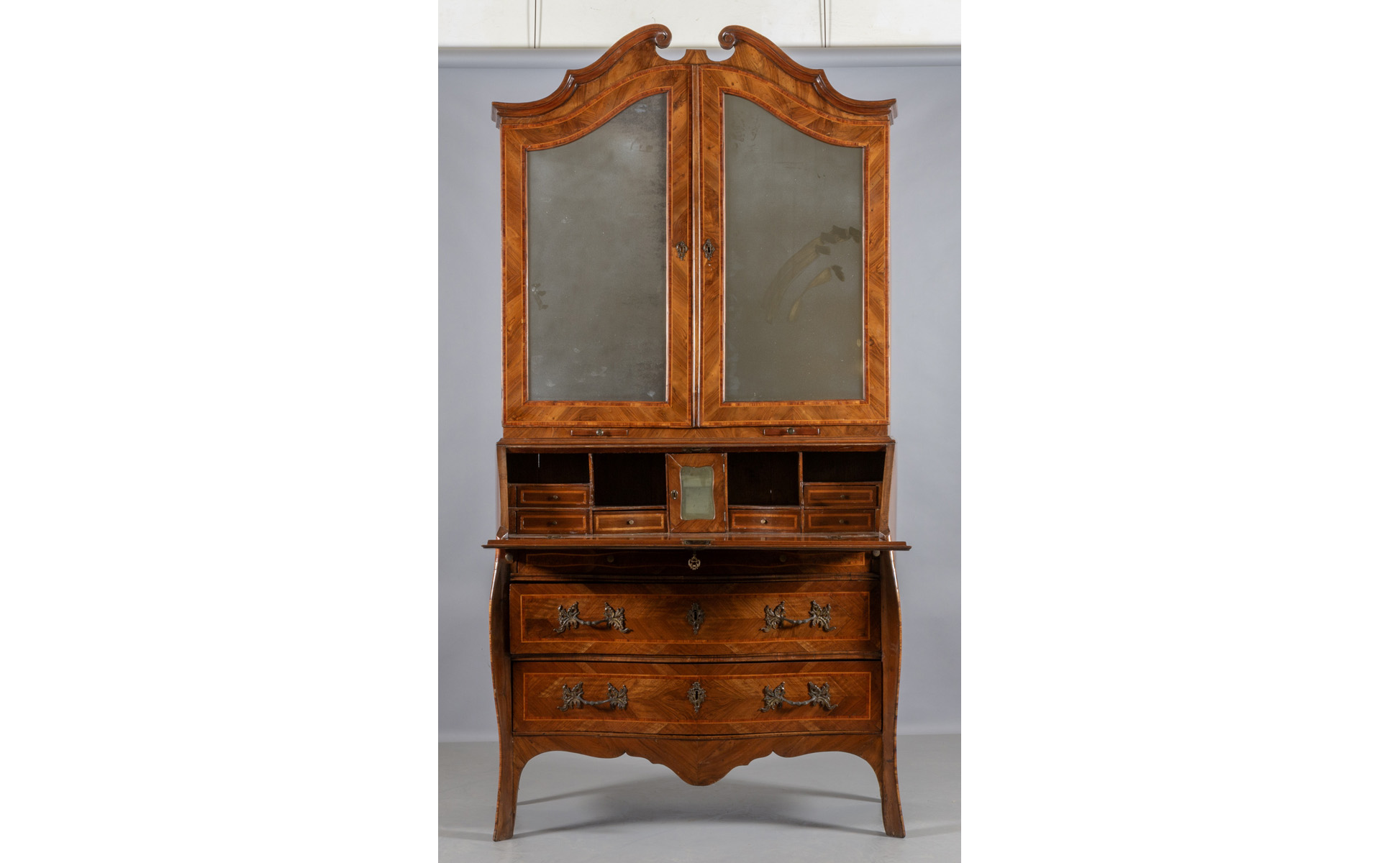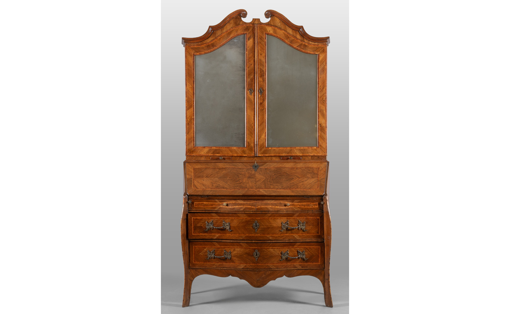 Ribalta con alzata Luigi XIV a tre cassetti movimentata sul fronte e sui fianchi lastronata in palissandro e filettata in bois de rose parte superiore a due grandi sportelli con specchi cappello a carabiniere Genova I metà sec.XVIII