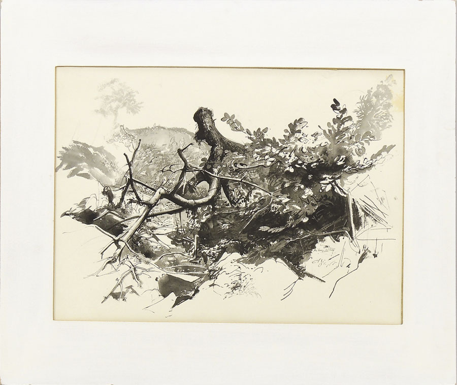 PIETRO ANNIGONI (1910-1988) Scorcio di bosco 1968 china acquerellata su carta, siglato e datato, residui di nastro adesivo lungo i margini e lieve ingiallimento in alto a destra, cm 40x51 FOREST VIEW, WATERCOLOURED INDIAN INK ON PAPER