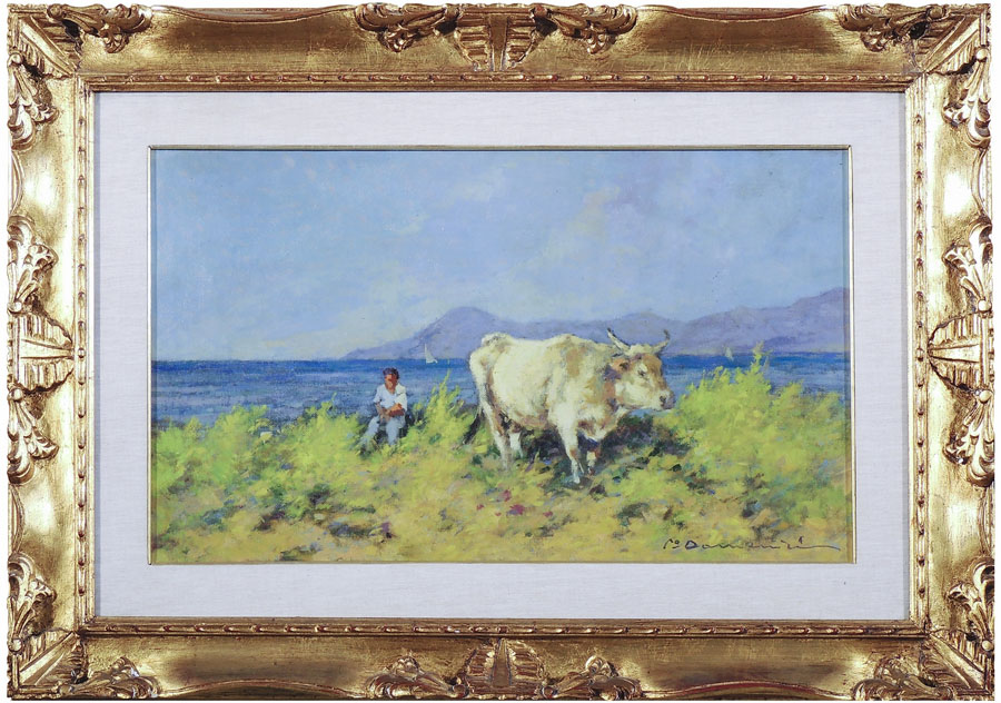 CARLO DOMENICI (1898-1981) Veduta da Portoferraio con contadino e armento Anni Quaranta olio su tela, firmato Al verso reca iscritto: ''Vacca sul mare Anno 46'' e '' Opera autentica del 1945 eseguita a Portoferraio (Elba) Carlo Domenici'', in cornice cm 39x65 PORTOFERRAIO VIEW WITH A FARMER AND OX, 40S, OIL ON CANVAS