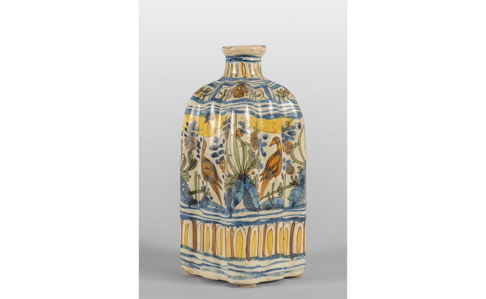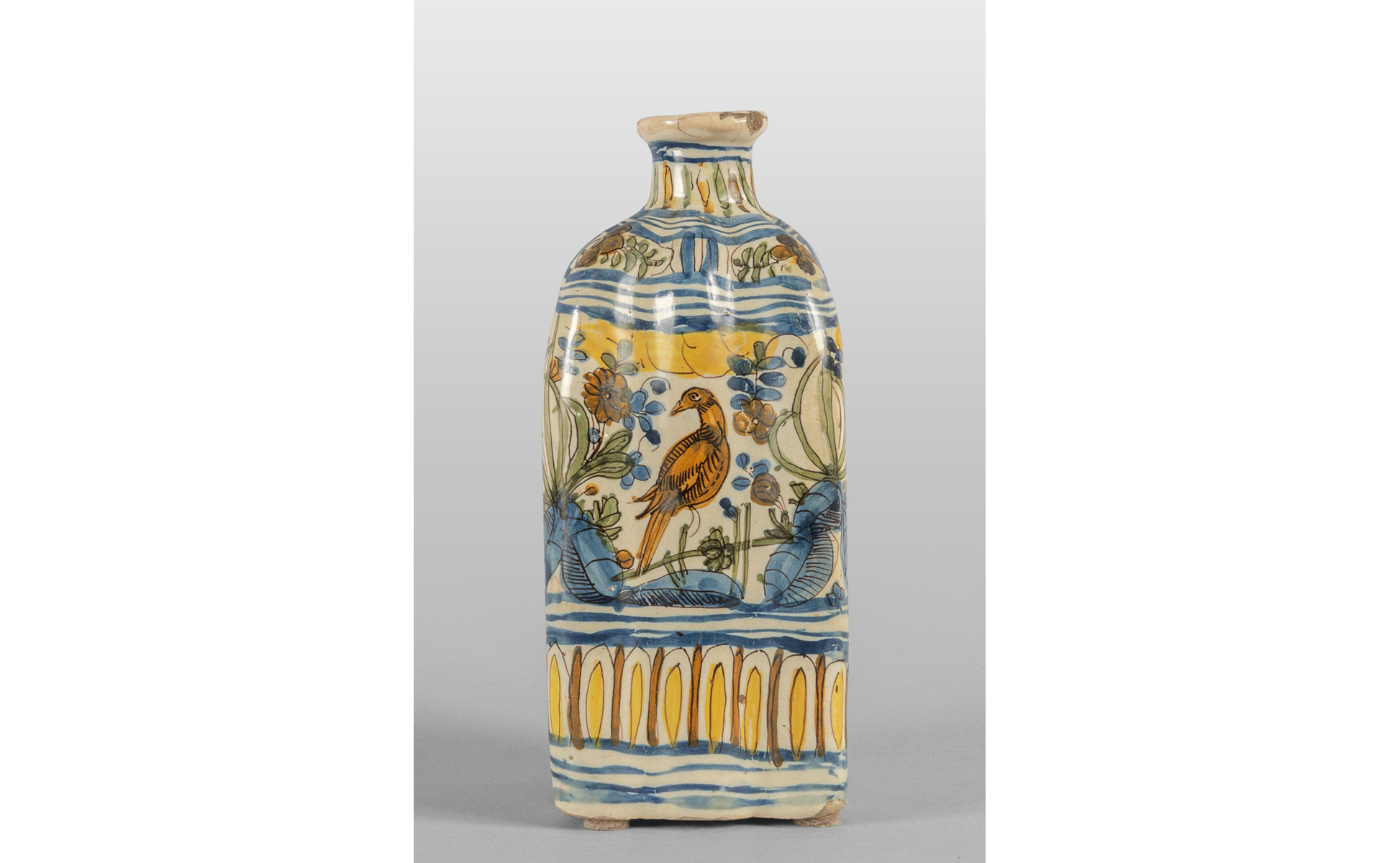 Bottiglia in maiolica a decoro calligrafico naturalistico in policromia Savona sec.XVIII