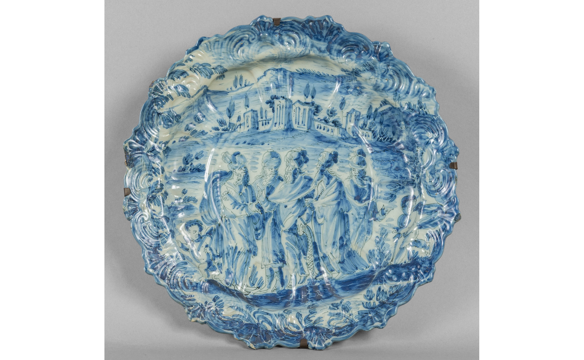 Piatto in maiolica modello argenteria a decoro di figure barocche in un paesaggio Savona sec.XVIII