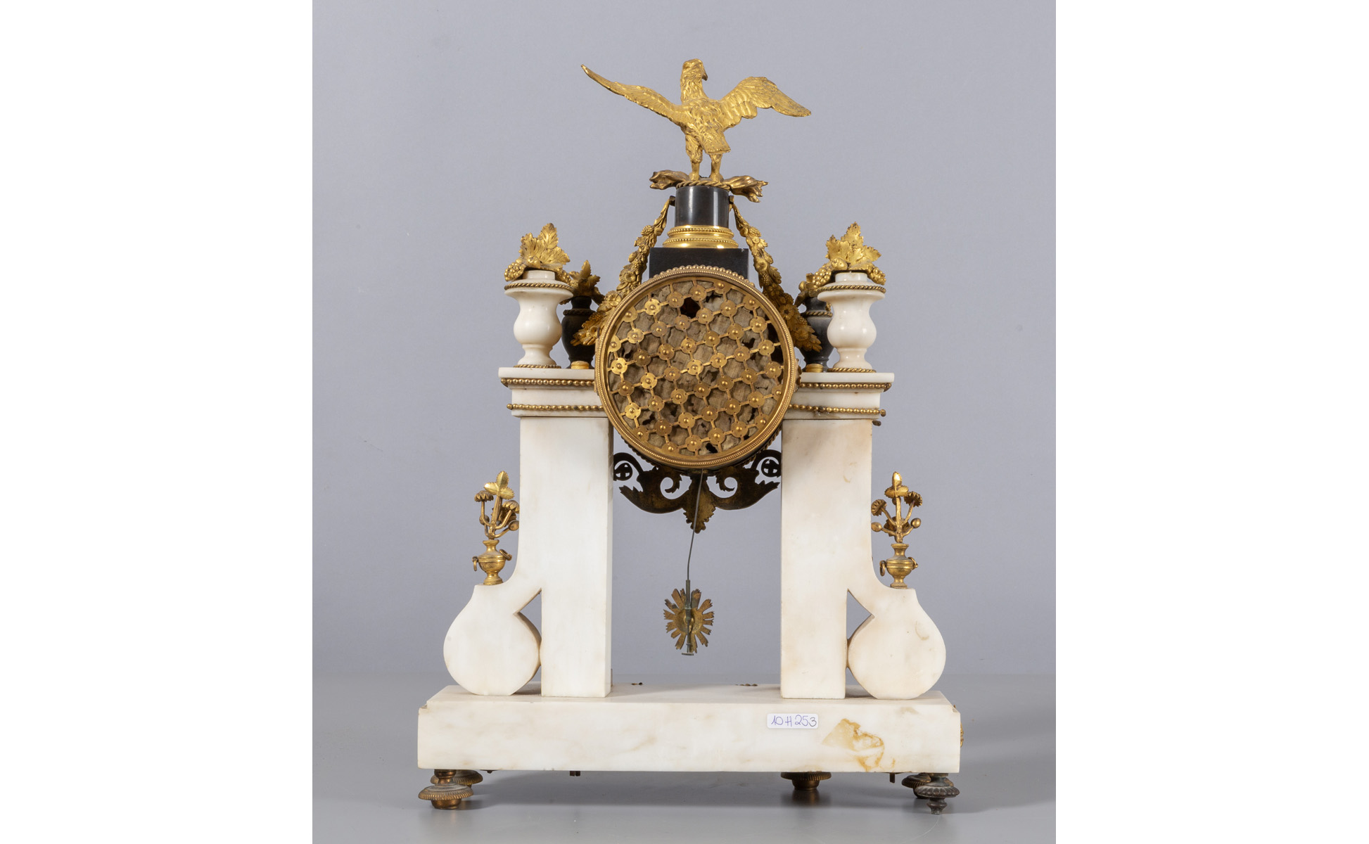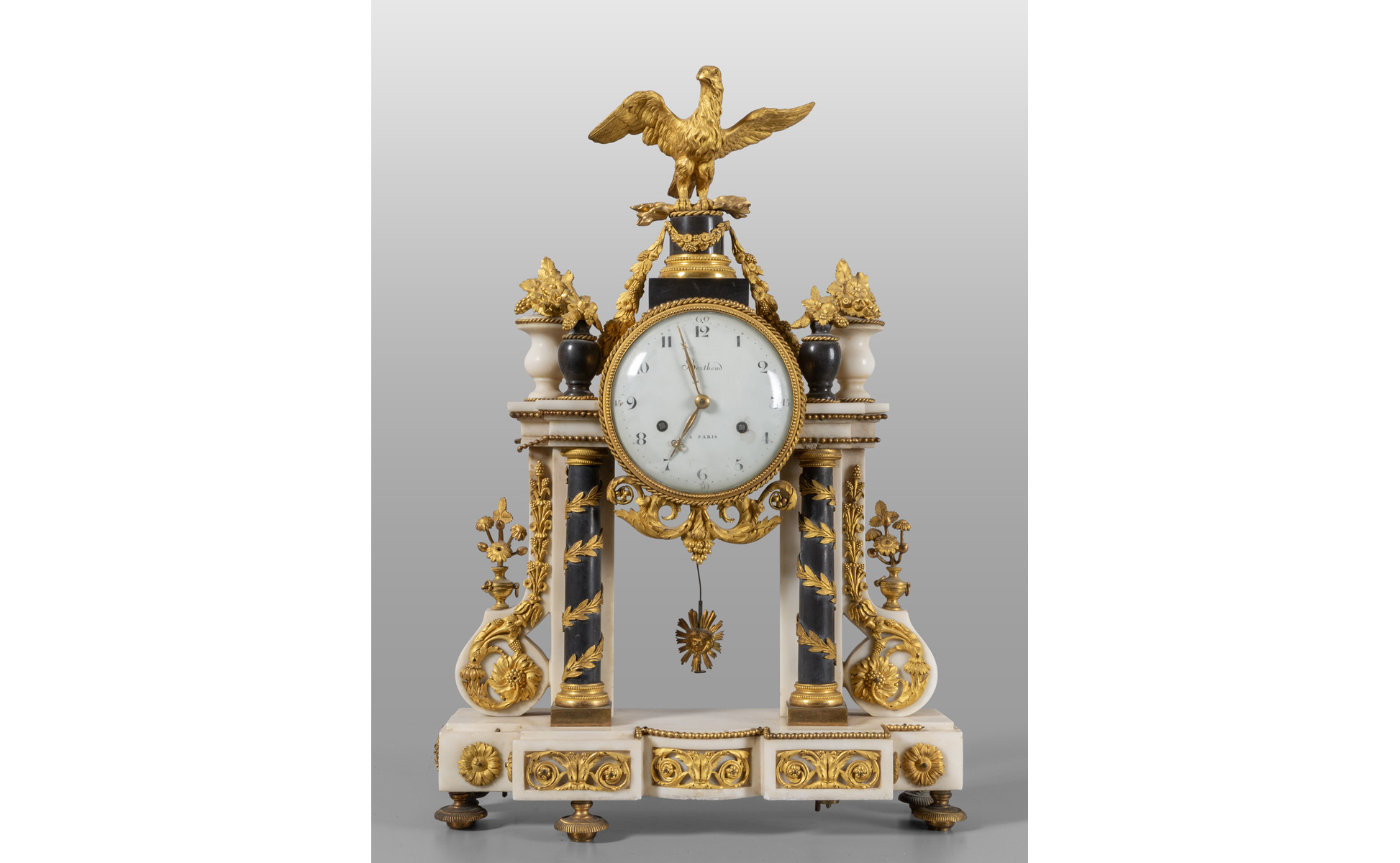 Orologio in marmo bianco ricca decorazione in bronzo macchina f.ta Berthoud à Paris II metà sec.XVIII