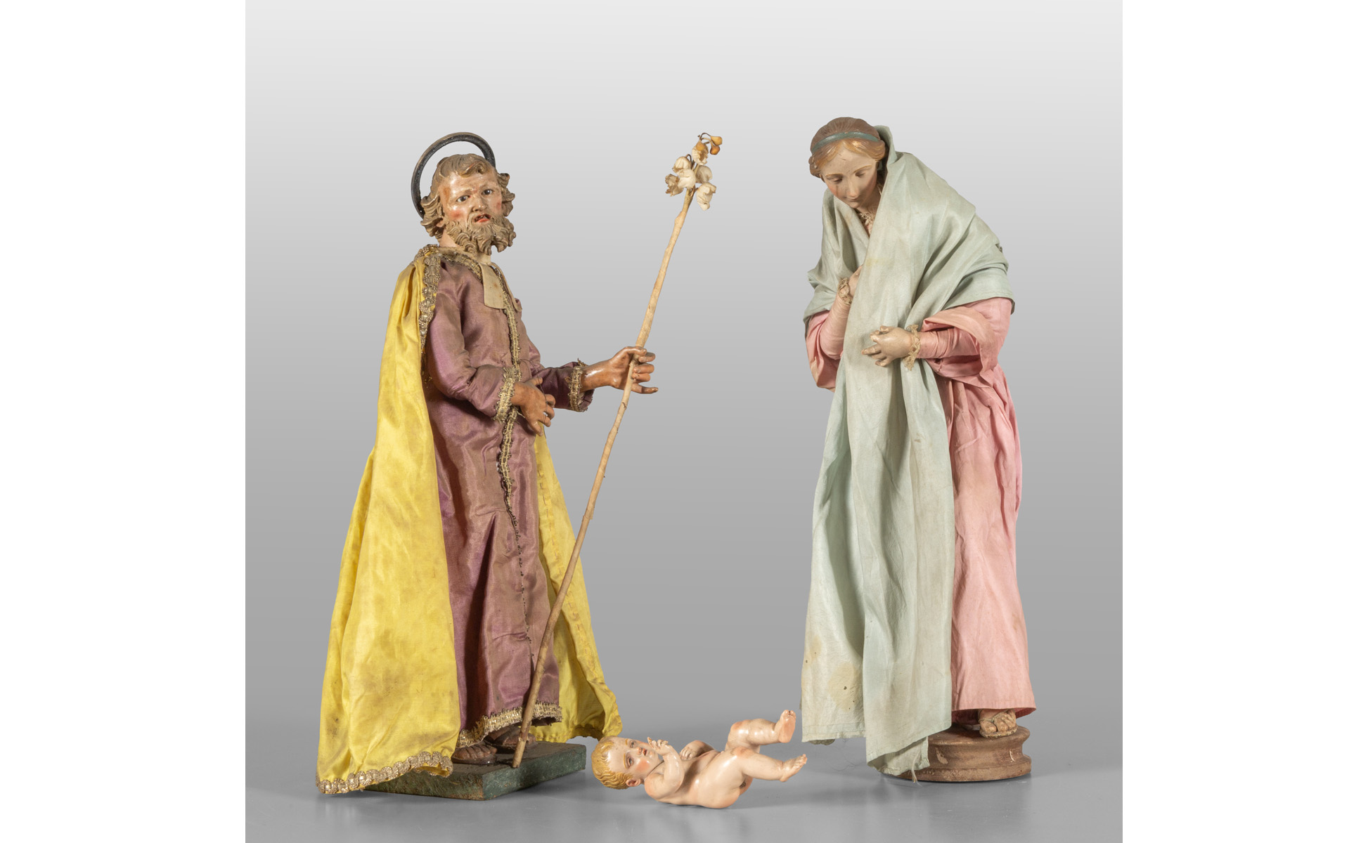 Sacra Famiglia tre sculture teste in terracotta policroma mani e piedi in legno policromo occhi in vetro abiti in seta Napoli sec.XVIII