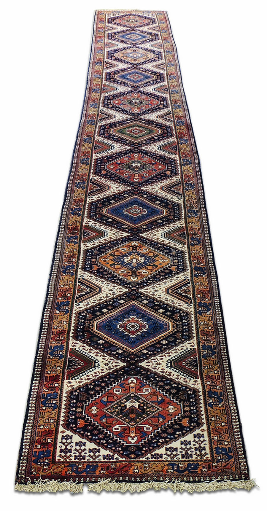 TAPPETO GALLERIA CAUCASICO fondo avorio, campo con undici medaglioni e disegni stilizzati nei toni del blu, rosso mattone e verde cm 84x590 LONG CAUCASIC CARPET