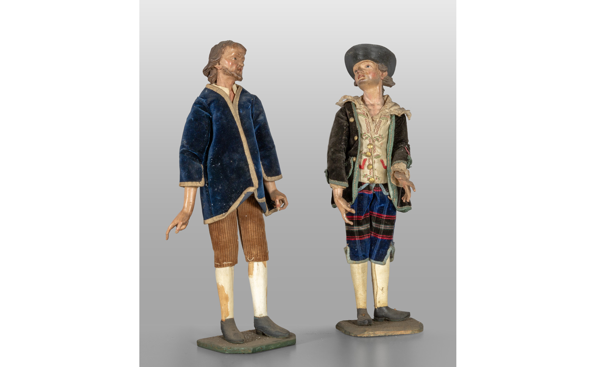 Figurine con abiti in velluto blu due sculture con teste in terracotta policroma mani e piedi in legno policromo occhi in vetro abiti in seta Napoli sec.XVIII