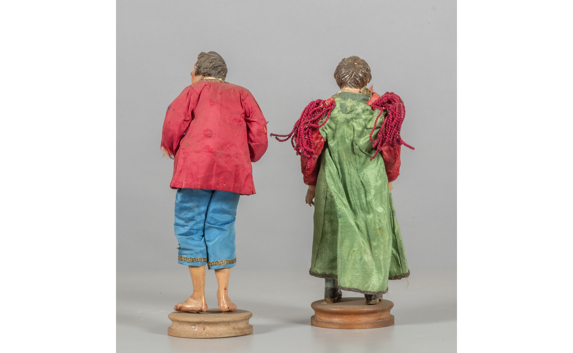 Ragazzi stupefatti due sculture con teste in terracotta policroma mani e piedi in legno policromo occhi in vetro abiti in seta Napoli sec.XVIII