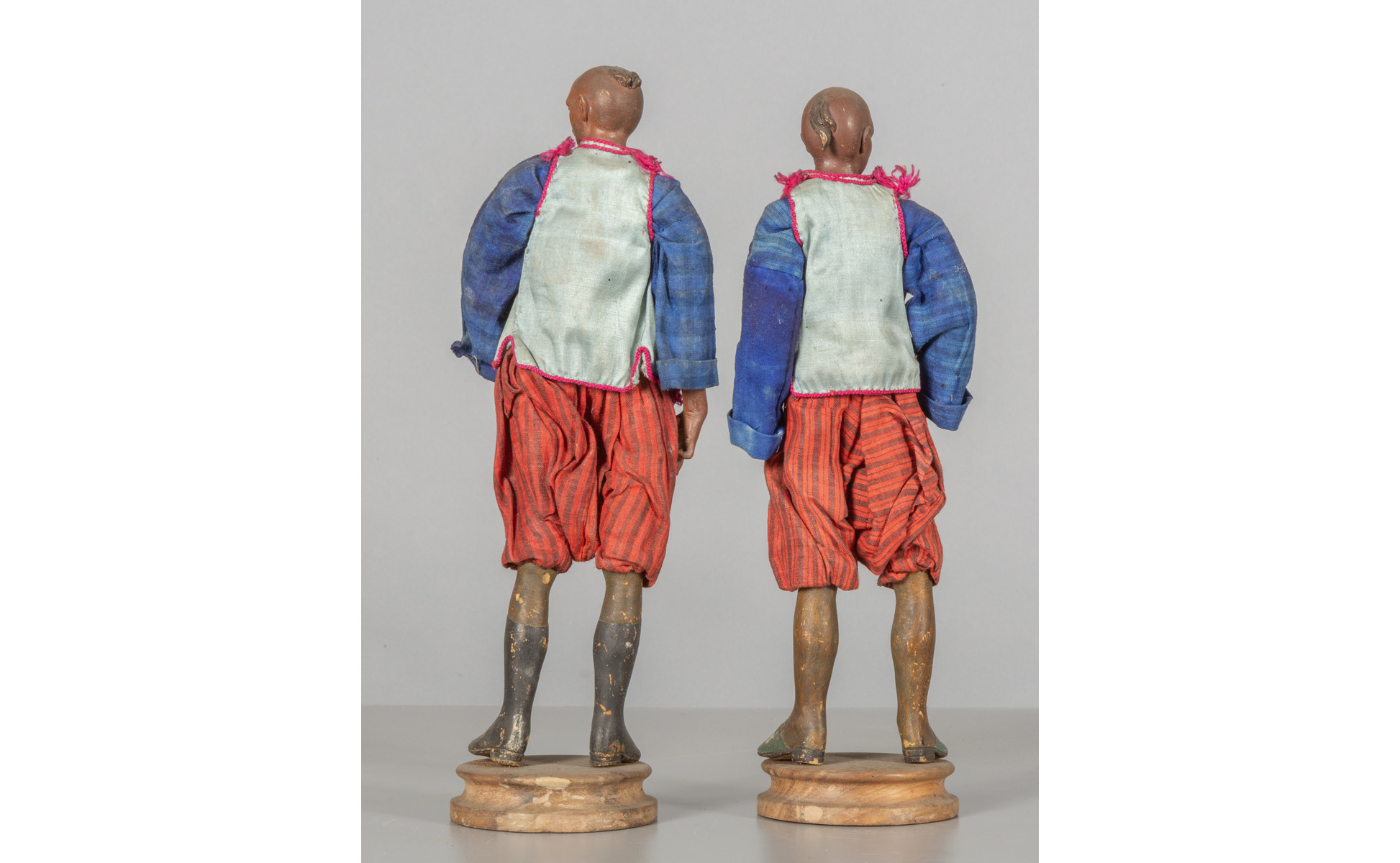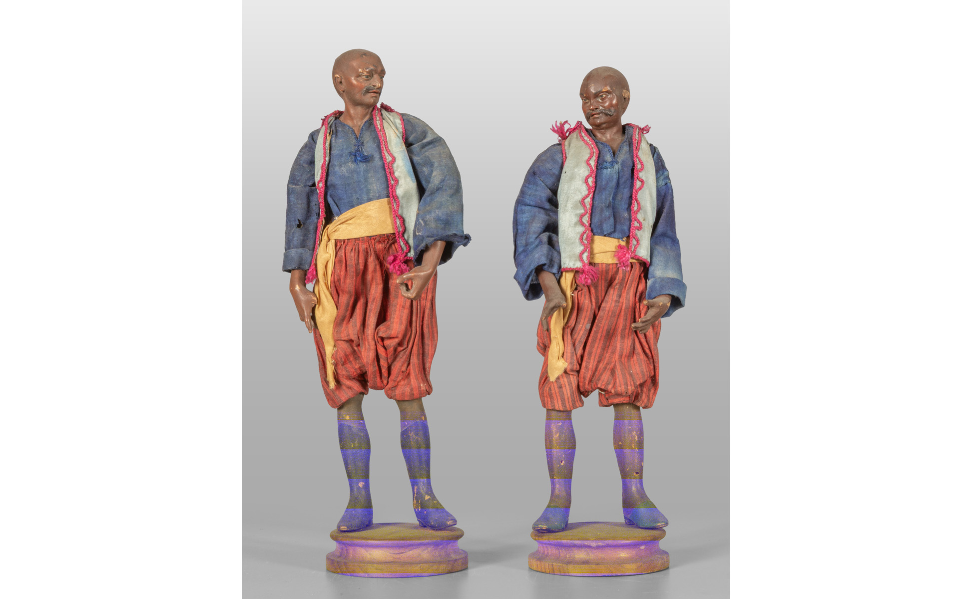 Coppia di orientali con pantaloni rossi teste in terracotta policroma mani e piedi in legno policromo occhi in vetro abiti in seta Napoli sec.XVIII