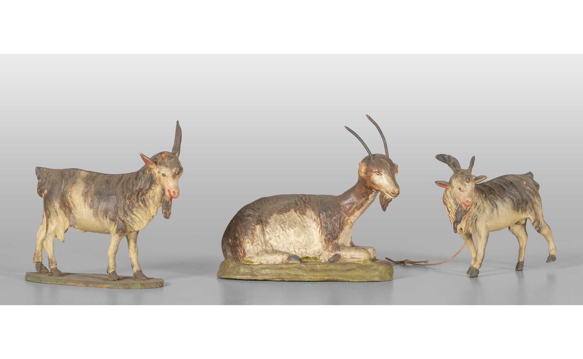 Tre statuine da presepio raffiguranti caproni due in piedi e uno seduto in legno policromo Napoli sec.XVIII piccoli difetti