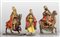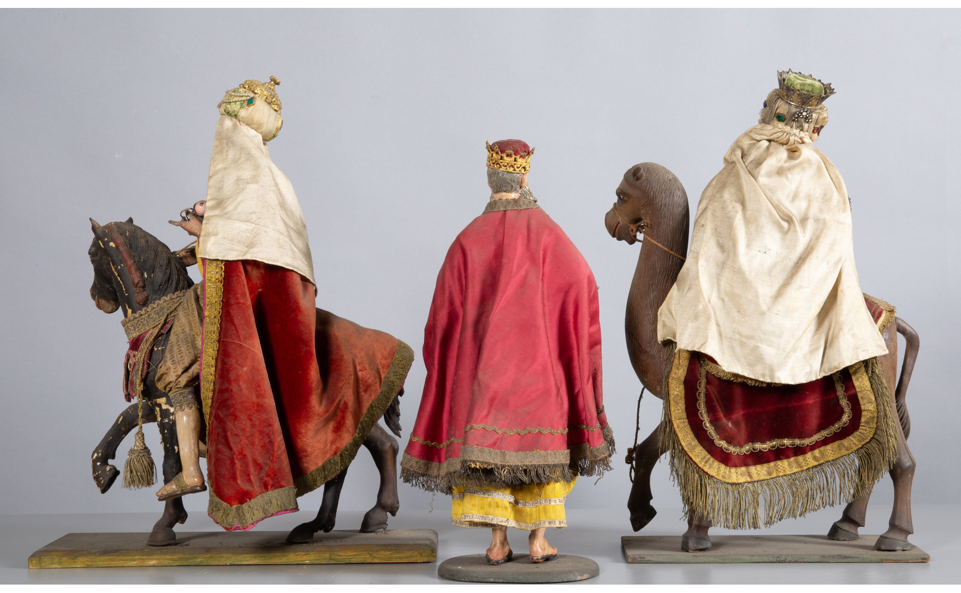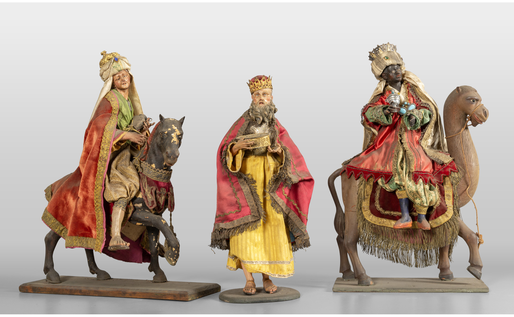 I tre Re Magi tre sculture una a cavallo di un dromedario una a cavallo e una in piedi teste in terracotta policroma mani e piedi in legno policromo occhi in vetro abiti orientali con tessuti impreziositi da ricami Napoli sec.XVIII