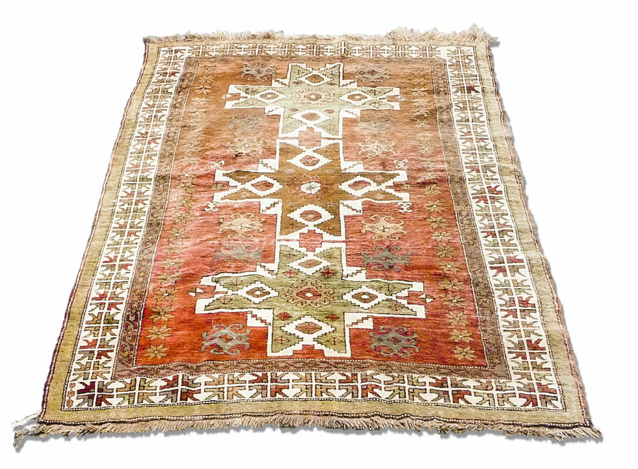 TAPPETO TURCO KARS fondo bordeaux, campo con tre medaglioni a croce e motivi...