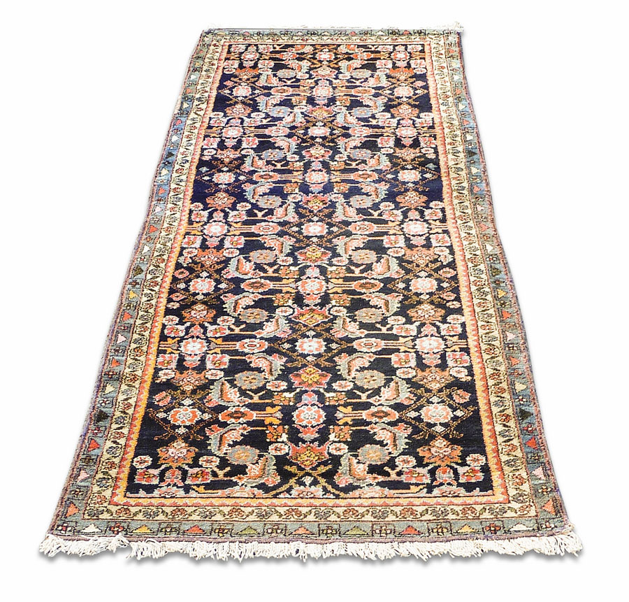 TAPPETO GALLERIA PERSIANO TABRIZ MALAYER 1950 circa fondo nero, campo con motivi floreali e disegni stilizzati nei toni del rosa, azzurro e verde acqua, colori vegetali, lievi tracce d'uso cm 290x93 LONG PERSIAN TABRIZ MALAYER CARPET, 1950 CIRCA