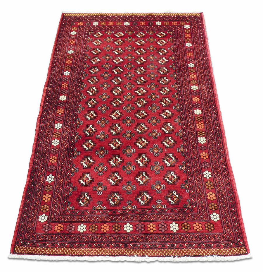 TAPPETO BUKARA fondo bordeaux, campo con motivi geometrici nei toni dell'avorio, arancio e marrone cm 120x218 BUKARA CARPET