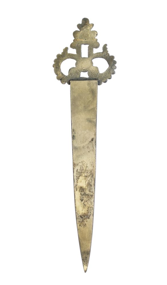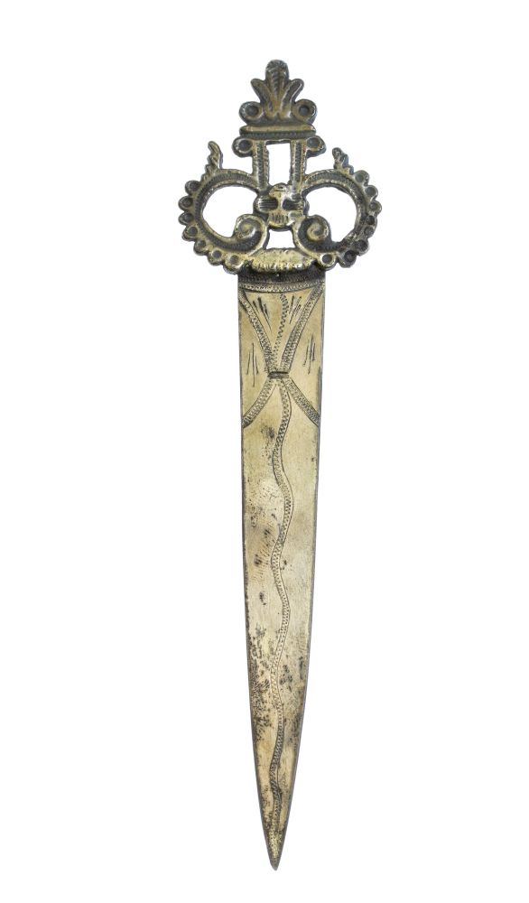 A forma di pugnale, inciso con elementi filiformi e con manico decorato con elementi floreali stilizzati.
