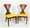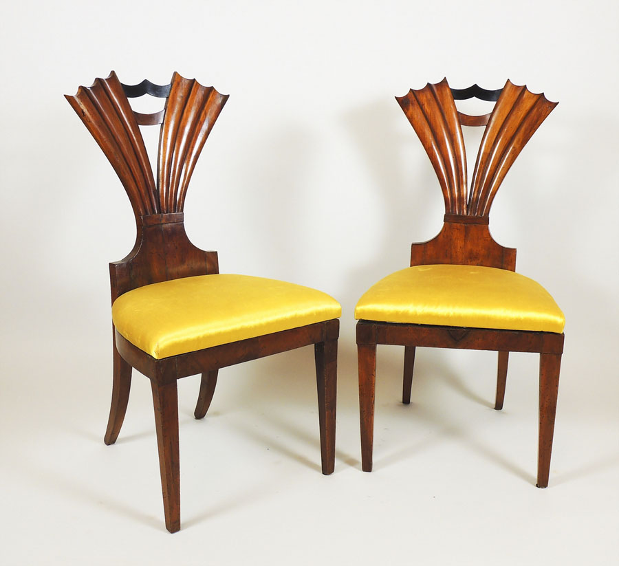 SERIE DI SEI SEDIE IN CILIEGIO metà del XIX secolo schienale con cartella intagliata con motivo a ventaglio ed in parte ebanizzata, gambe anteriori a faretra, le posteriori a sciabola, sedute imbottite e rivestite in raso giallo oro A SET OF SIX CHERRYWOOD CHAIRS, MID 19TH CENTURY