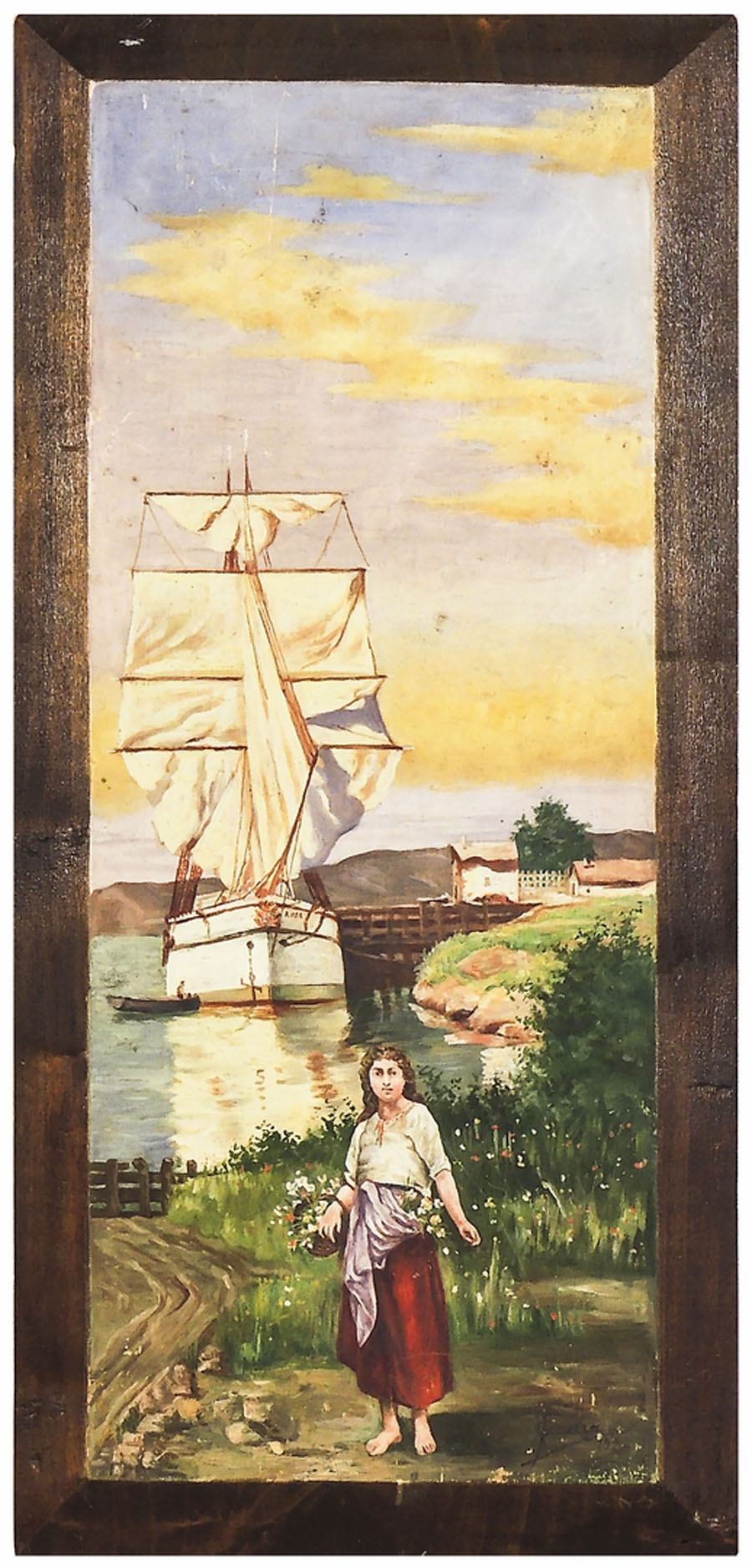 SCORCIO DI PAESAGGIO LACUSTRE CON FANCIULLA E BARCA olio su tavoletta, firmato e datato Guerra 1920 cm 57x26 LAKESCAPE WITH A GIRL AND BOAT, OIL ON PANEL