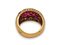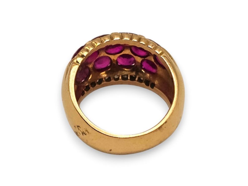 in oro giallo 18k, modellato come una fascia, incastonato con tre file di rubini profilati da diamanti.