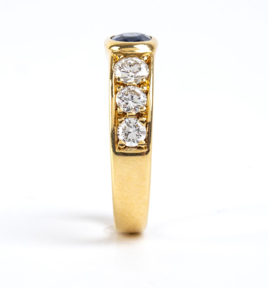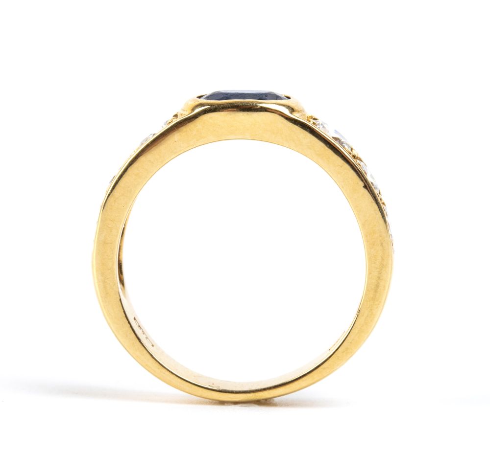 in oro giallo 18k, incastonato con zaffiro vale affiancato da paste vitree incolori.