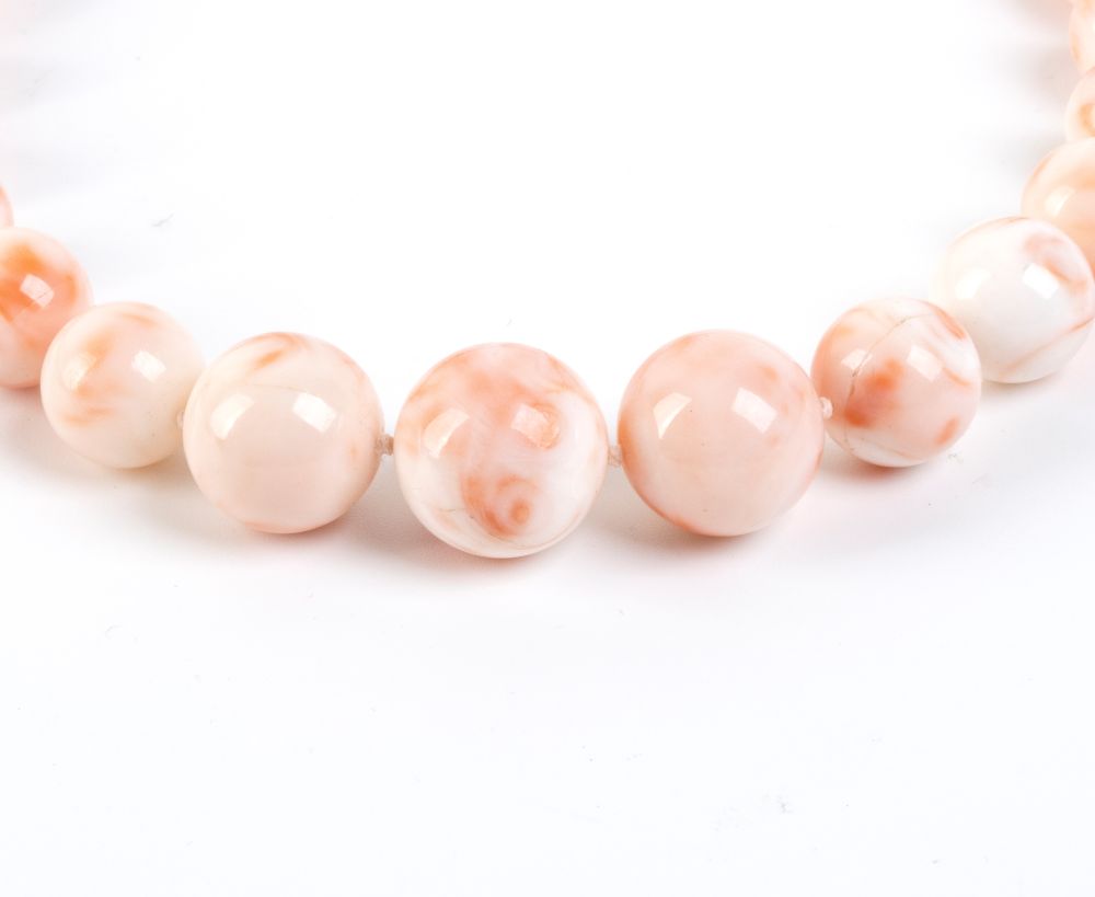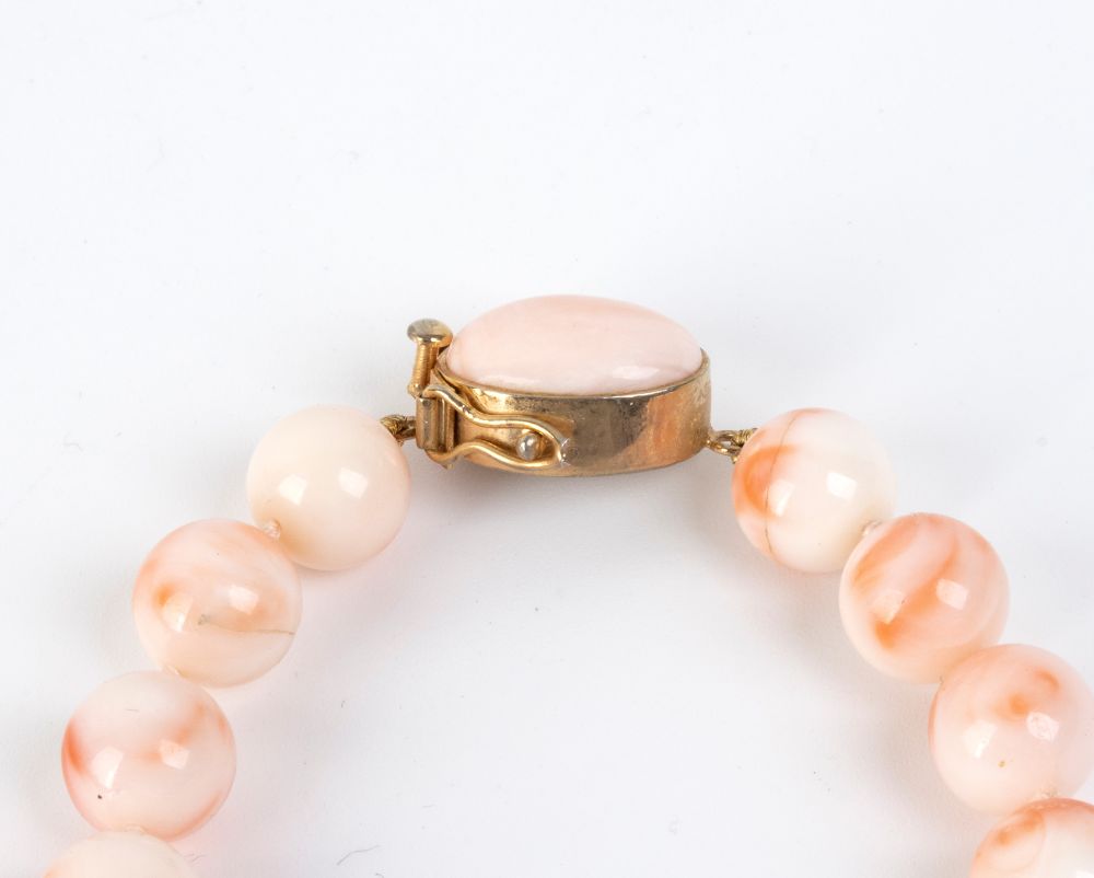 ad un filo di sfere di corallo Deep Sea (Corallium Spec. Novarum) disposto in gradazione, con chiusura in oro giallo.