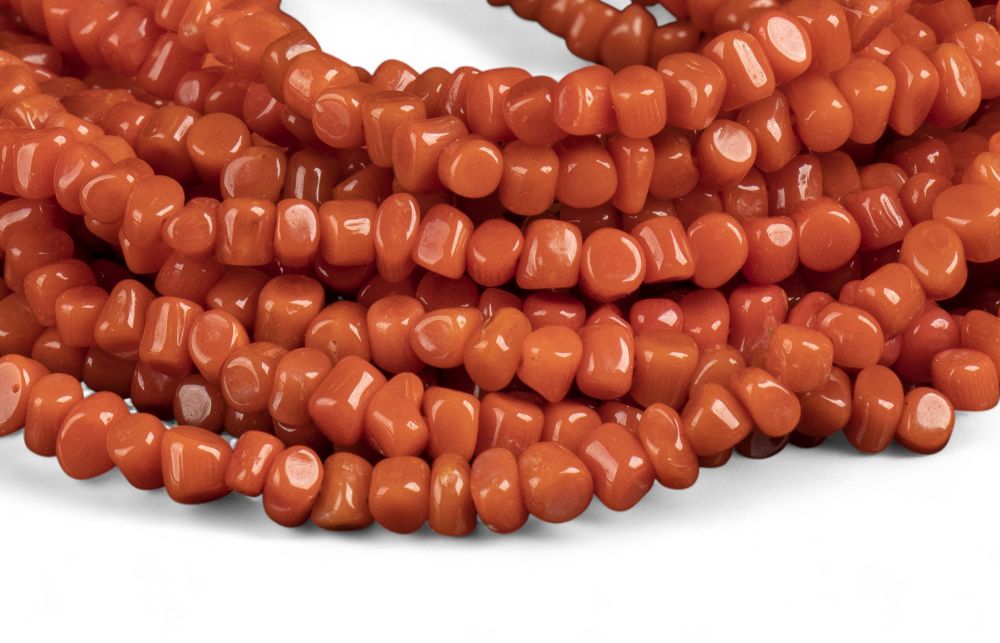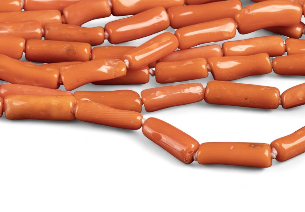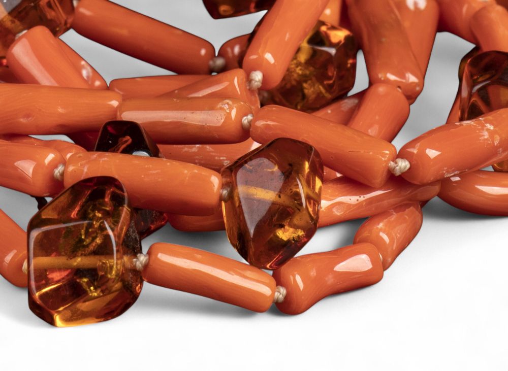 lotto composto da una collana a 4 fili di barilotti grezzi in corallo rosso del Mediterraneo (Corallum Rubrum); collana a 16 fili di ciottoli di corallo rosso del Mediterraneo (Corallum Rubrum); collana a 8 fili di cilindri irregolari di corallo Cerasuolo (Corallum Eliatus) e ambra chiarificata; un bracciale a 11 fili di cilindri irregolari in corallo Cerasuolo (Corallum Eliatus). Montatura in argento 925/1000.