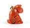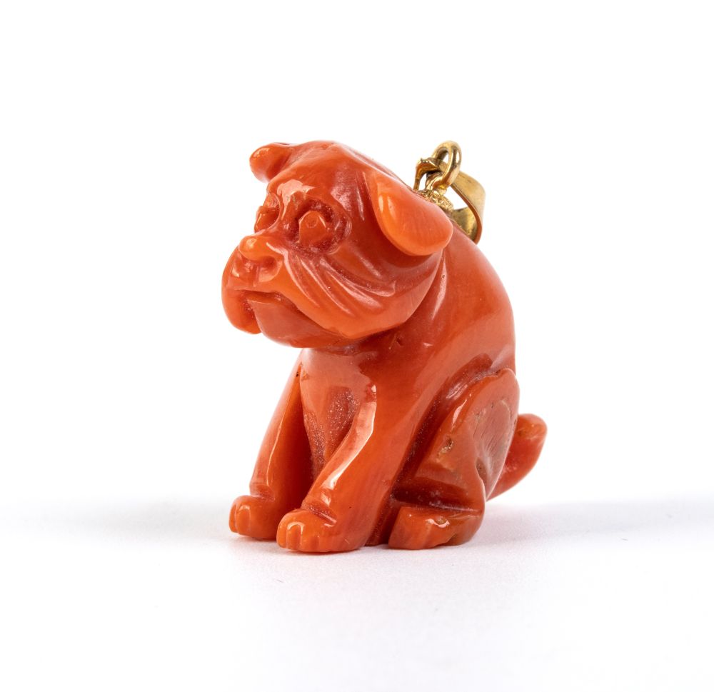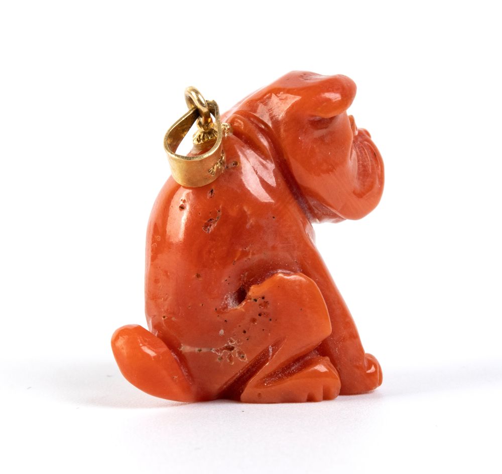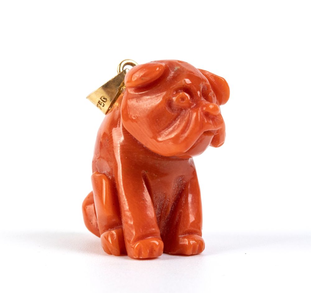 Raffigurante un cane accovacciato scolpito in corallo Cerasuolo (Corallium Elatius) e occhiello in oro giallo.