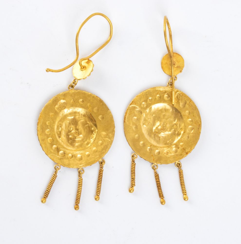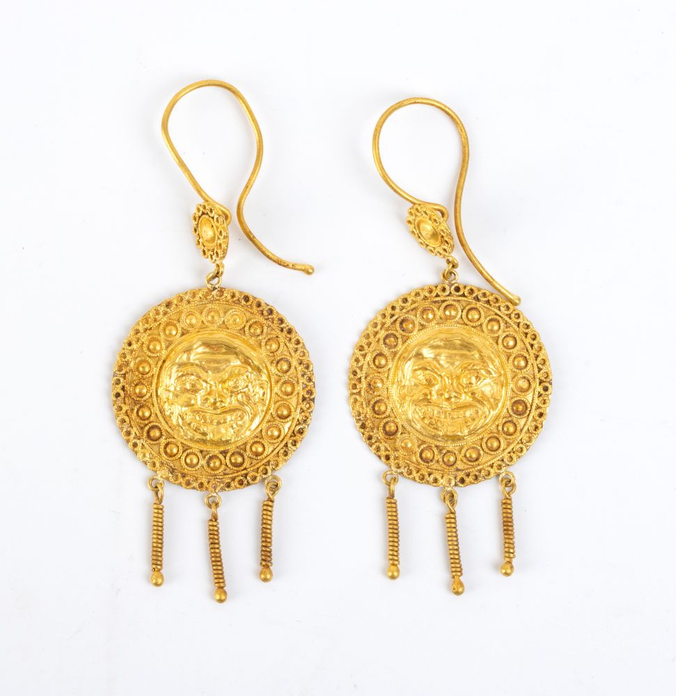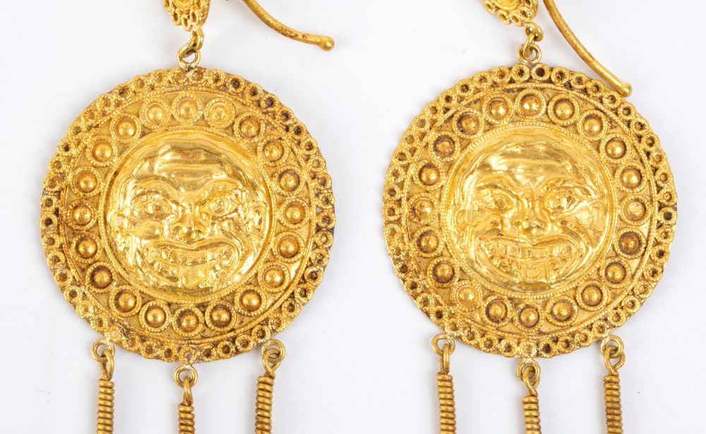 in oro giallo, con lastra lavorata a sbalzo con raffigurazioe di maschere tra cornice in motivi a fligrana e microsfere.