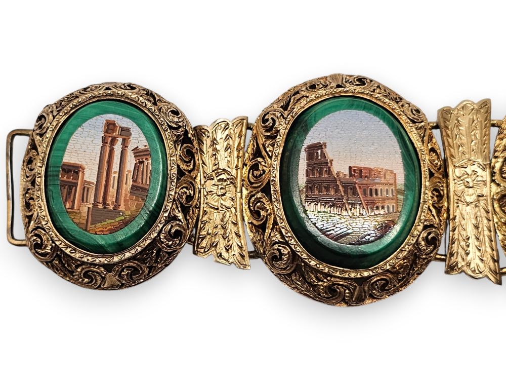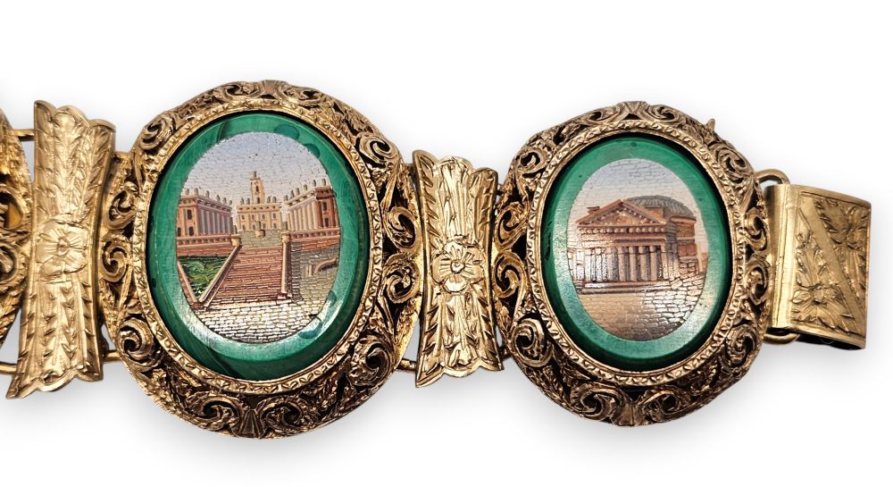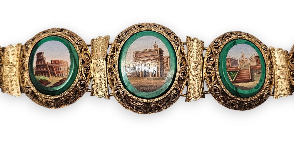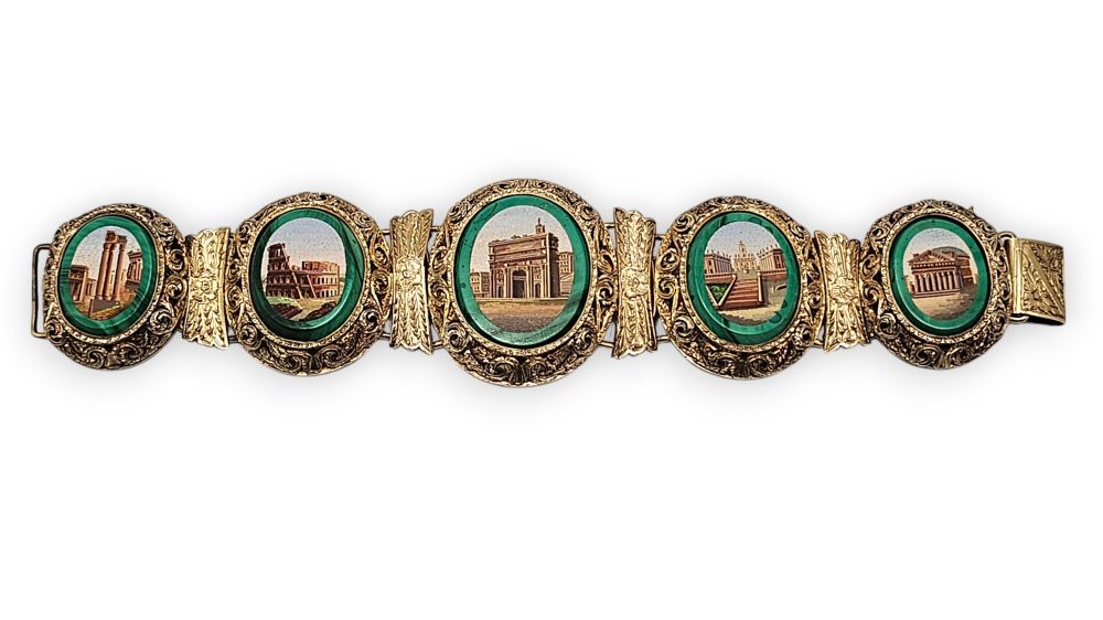 con 5 micromosaici raffiguranti monumenti della Roma classica e rinascimentale, maglie e castoni decorati incisi a motivi vegetali.